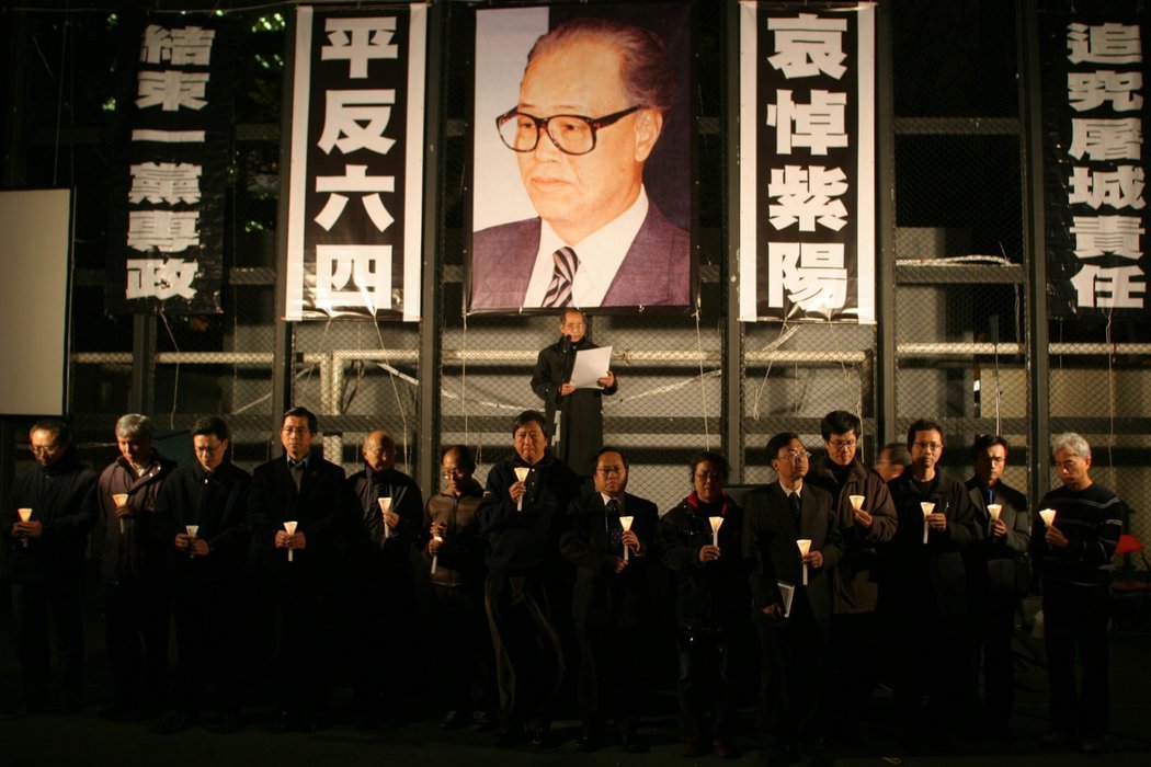 2005年1月21日,香港民主派组织“支联会”在维多利亚公园举行悼念赵紫阳的烛光晚会。上周五,赵紫阳的骨灰于北京安葬。 ALEX HOFFORD/EUROPEAN PRESSPHOTO AGENCY