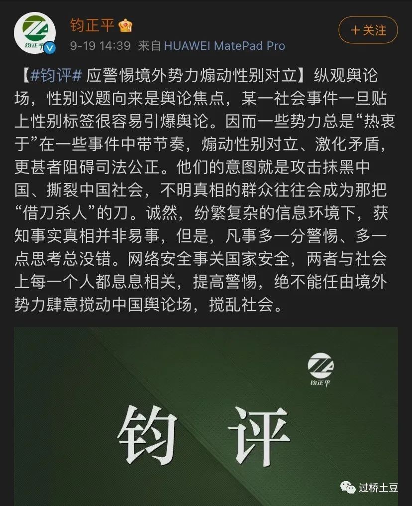 9月19日,解放军报旗下微博账号“钧正平”发表了这样一段话,认为性别对立是“境外势力”煽动。