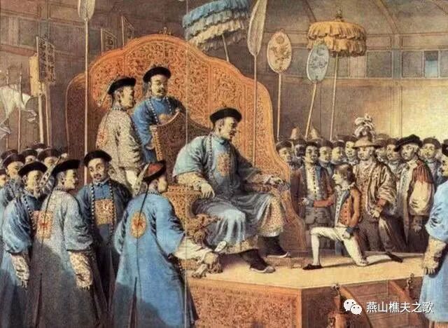 1792年10月,正值法國大革命如火如荼之際,英國國王喬治三世派遣以馬戛爾尼勳爵為首的一個龐大使團——使團包括軍事、測量、繪圖、航海、醫生、教士、畫家、譯員、機械師、哲學家、植物學家等一百多人和船員六百餘人,分別乘三艘航船,經過十個月的航行,於1793年7月到達中國,並於9月14日在承德避暑山莊覲見了乾隆皇帝,向乾隆皇帝祝賀八十壽辰。這個事件在中西交往史上具有重大意義,但在兩個帝國的統治者看來意義卻有著顯著差別。在喬治三世致乾隆皇帝的信中,馬戛爾尼勳爵使華被闡述為「正是謀求我們兩大文明帝國友好往來的好時機」,「希望特派一位有權柄之人常駐貴國」,以便利和保護兩國之通商。而在乾隆皇帝的回函中,英使來華只是表明「爾國王遠在重洋,傾心向化」、「恭順之誠」、朕「深為嘉許」而已。對於英使提出的「買賣一節」,乾隆皇帝則斷然加以拒絕,強調「此則與天朝體制不合,斷不可行」,「天朝自有天朝禮法,與爾國各不相同」。[1]至此,馬戛爾尼認識到「中國向來閉關自守,不知世界大勢」,亦不知「締結條約、互相通商,為現今文明各國共有之辦法」,「中國人固執不化,將來永無與他國人締結交通之一日」。[2]