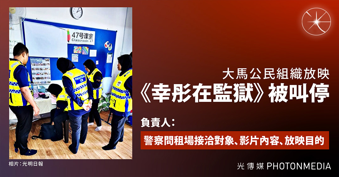 支聯會前副主席鄒幸彤涉「煽動顛覆國家政權」案還押至今逾兩年,近日紀錄片《幸彤在監獄》在全球多地放映。馬來西亞公民組織「柔南黃色行動小組」於上週六(30日)新山場放映活動開始前,內政部和警員到場以「未經電檢局批准」為由禁止放映,並帶走負責人李成鋼問話,李其後獲釋。他向《光傳媒》透露,警員在盤問期間詢問關於租場接洽對象、影片內容及放映目的,執法人員更「充公」了儲存影片的硬碟,未知何時歸還。
