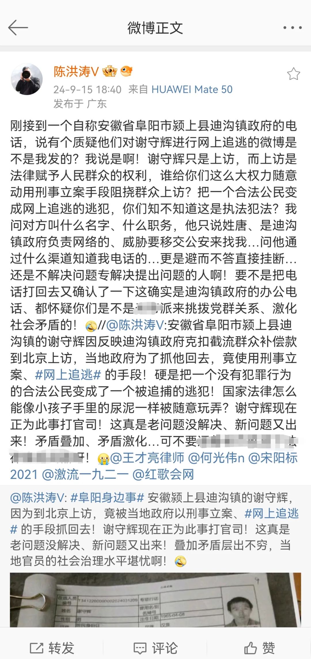 陈洪涛则回应对方称,该微博系其发布,谢守辉上访,是法律赋予群众的权利;职能部门随意动用刑事手段,阻挠群众上访,将合法公民变成“逃犯”,是知法犯法。