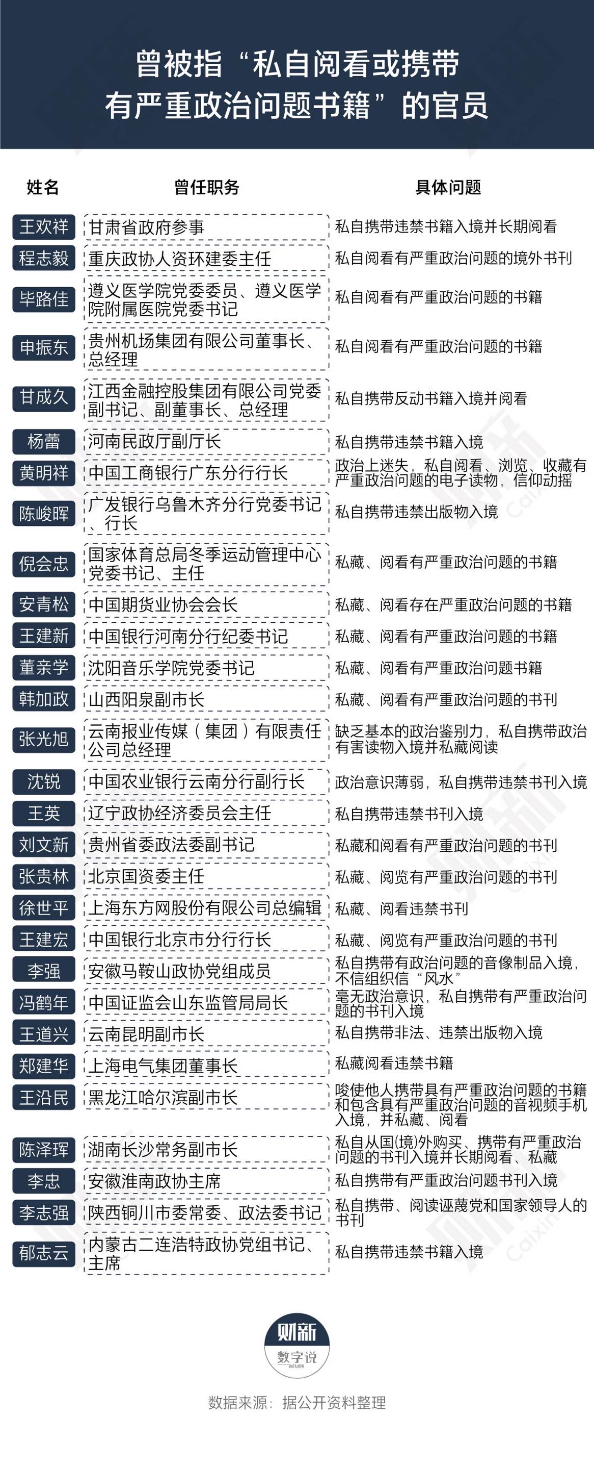 在其他级别官员中,类似情况亦不鲜见。据公开资料披露,被指“私自阅看或携带有严重政治问题书籍”的官员至少还包括: