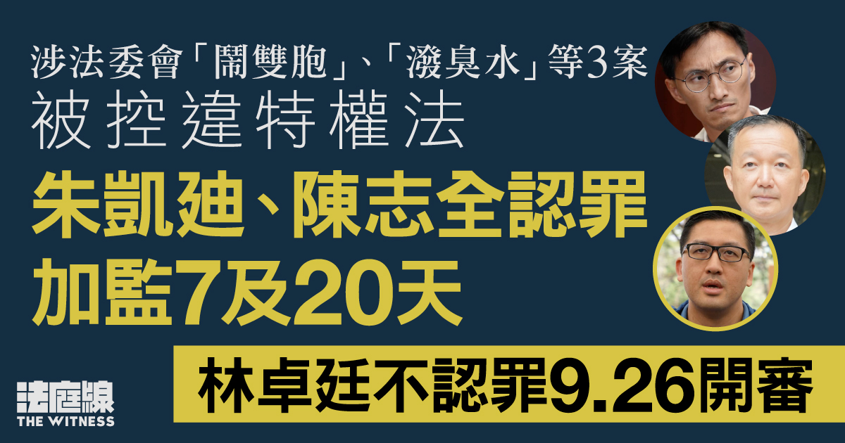 正就「47 人案」服刑的 3 名前立法會議員朱凱廸、林卓廷及陳志全,周二(11 日)在西九龍裁判法院,就著 3 宗被指違「特權法」、涉 2019 至 2020 年的立法會會議期間衝突案件應訊。朱凱廸及陳志全認罪,判囚 14 天及 32 天,考慮 2 人正就「47 人案」服刑,官指部分刑期可同期執行,可視為加監 7 天及 20 天;林卓廷則不認罪,押後 9 月審訊。