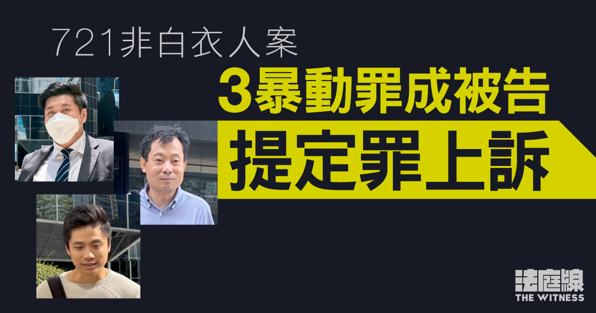 前立法會議員林卓廷與另外 6 名「非白衣人」,被裁定 721 在元朗站大堂參與暴動罪成,上月被區院法官陳廣池判囚 2 年 1 個月至 3 年 1 個月。高院資料顯示,當中楊朗、尹仲明及葉鑫昇 3 人周三(12 日)提出定罪上訴。案件暫未排期聆訊。