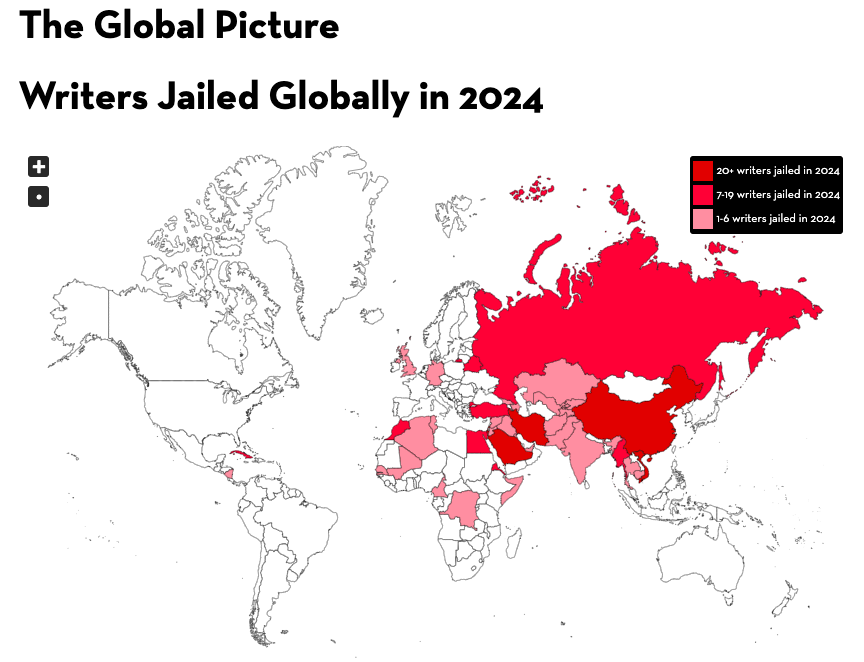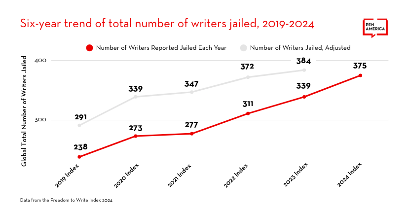 根據《寫作自由指數2024》最新報告,2024年有至少375名作家被囚禁、遍佈40個國家,較去年在33個國家被囚禁的339名作家有所遞增。2024年被囚禁的作家當中,近一半是少數族裔,如維吾爾人、西藏人、蒙古人,他們大多被加控「分裂國家政權」罪被捕。報告發現,中國被囚作家中有三分之一主要為網絡評論員,其中9人為女性,另有33人未被正式起訴或「未審先囚」遭長期羈押。