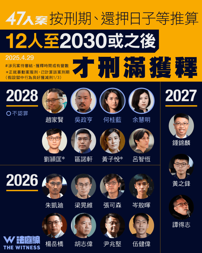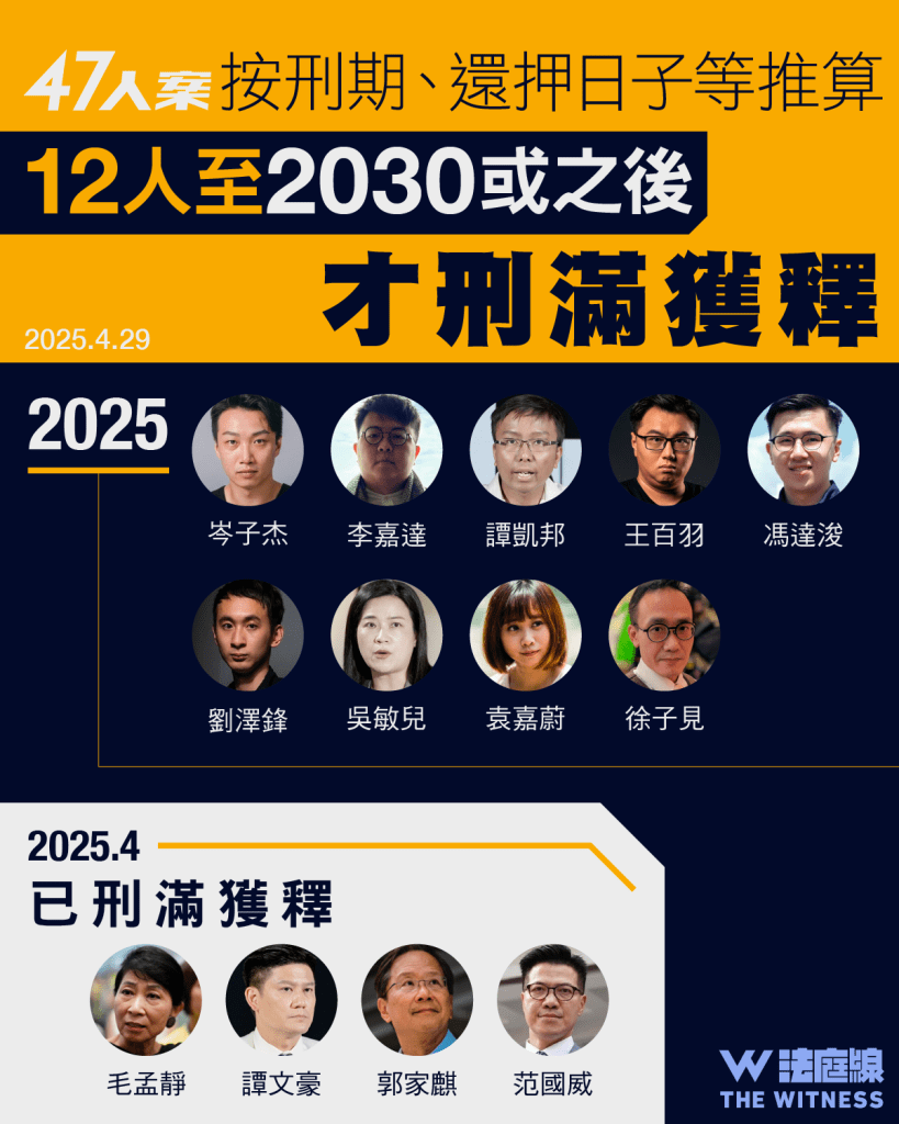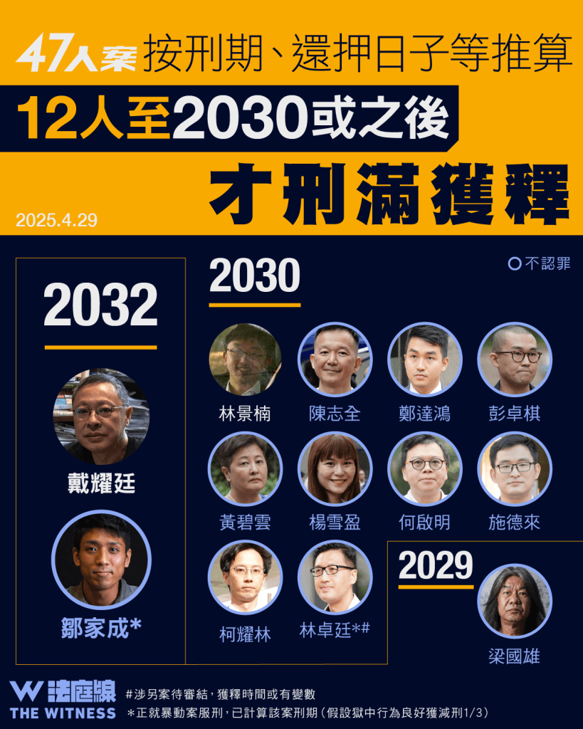 《法庭線》亦整理餘下在囚被告預計刑滿獲釋時間,料今年仍陸續有 9 人出獄,而另外的 12 人預計將於 2030 年或之後才出獄。
