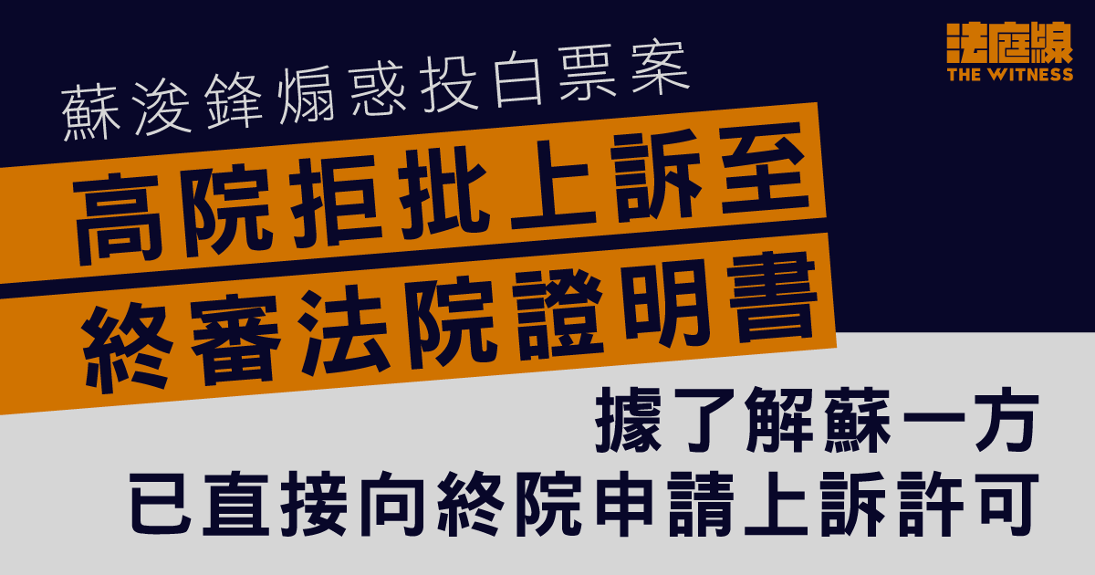 蘇以案件呈述方式提上訴,爭議控罪不合理限制言論自由,被高院法官駁回,蘇周二(27 日)向高院申請上訴至終審法院證明書,再被駁回。據了解,蘇一方已直接向終院申請上訴許可。