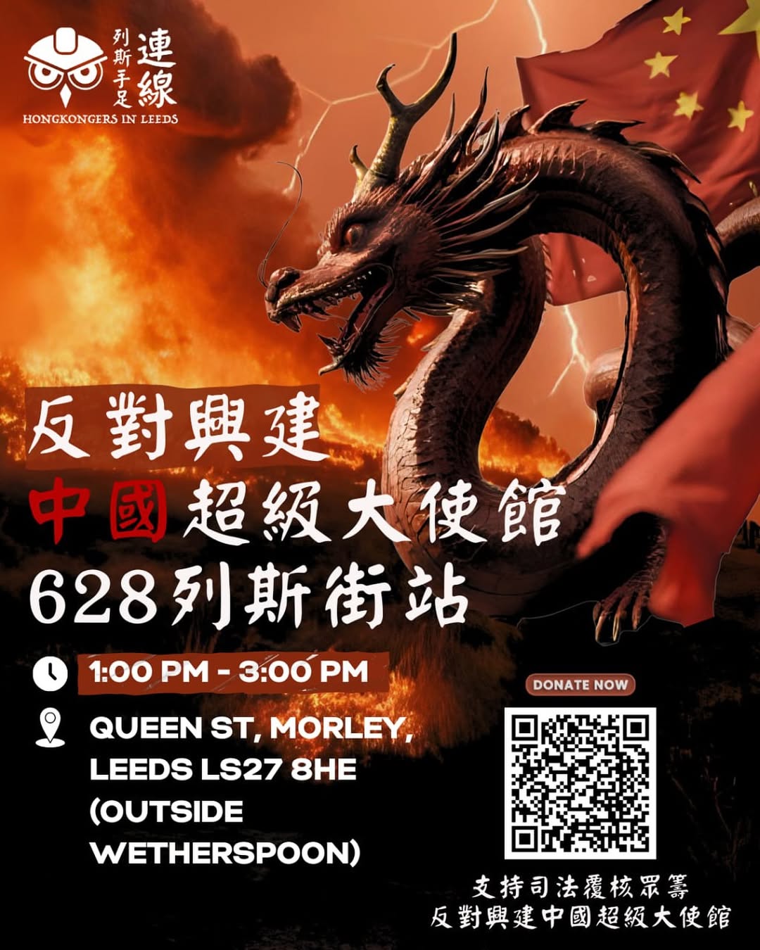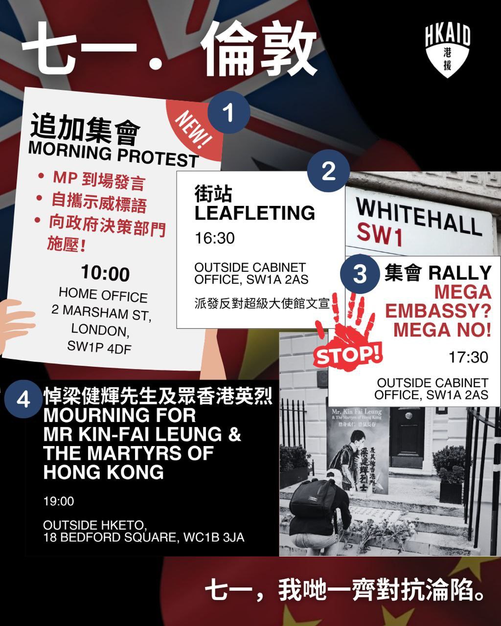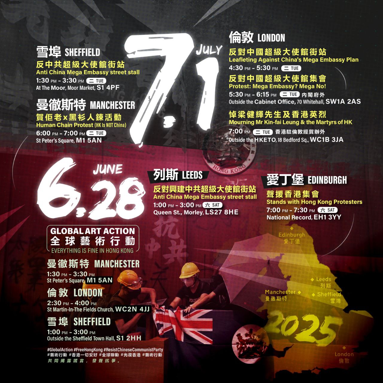 在英國,列斯、愛丁堡、雪埠、曼徹斯特、倫敦等多個城市,於6月28日、7月1日這兩天以街站、藝術行動、集會形式舉辦多場活動,反對興建中國超級大使館,也會在香港駐倫敦經貿辦外悼念「銅鑼灣刺警案」梁健輝。
