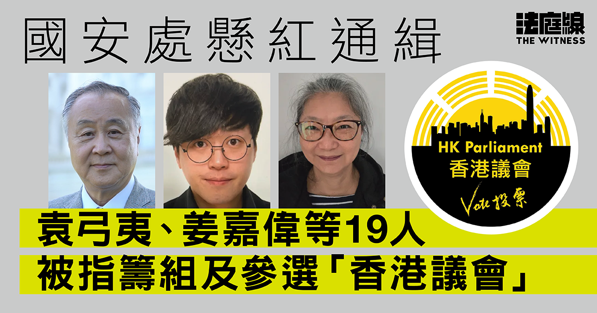 國安處周五發稿公布,懸紅通緝 19 人,其中時事評論員袁弓夷、《亞洲週刊》創刊編輯何良懋、「升旗易得道」頻道主持霍嘉誌和蔡明達、陳麗珍、悉尼科技大學中國研究中心副教授馮崇義、「美國之音」普通話組前主任龔小夏、國際人權協會理事吳文昕、理工大學建築及房地產學系前助理教授曾偉藩共 9 人,涉於 2022 年 7 月 27 日至 2025 年 6 月 30 日,參與「香港議會選舉籌備委員會」,籌備「香港議會」的選舉。