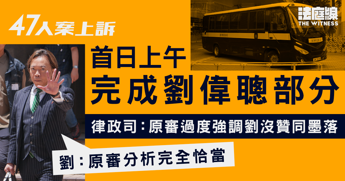 民主派初選案的上訴聆訊,周一(14 日)早上開始,首先處理律政司對劉偉聰無罪裁決的上訴。律政司一方陳詞時引原審裁決書,指過度考慮劉偉聰沒贊同〈墨落無悔〉一事,但案中另有壓倒性證據,證明劉知悉「35+」目的仍然參選。