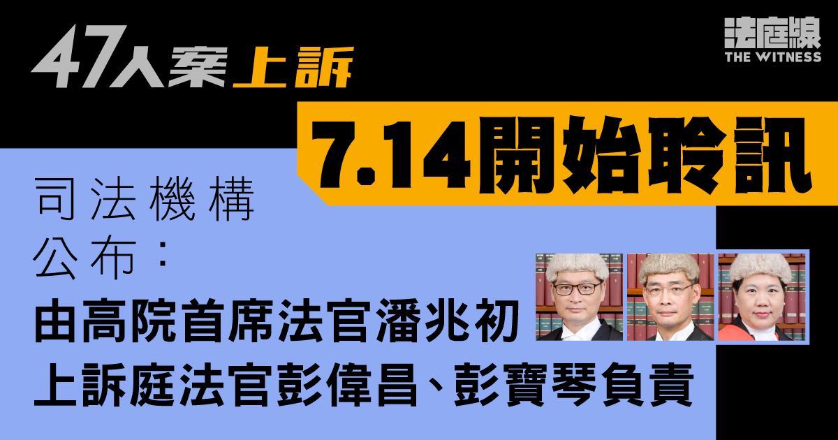 司法機構最新顯示,案件由 3 名法官負責審理,分別為高院首席法官潘兆初、上訴庭法官彭偉昌及彭寶琴,惟暫未顯示聆訊地點。