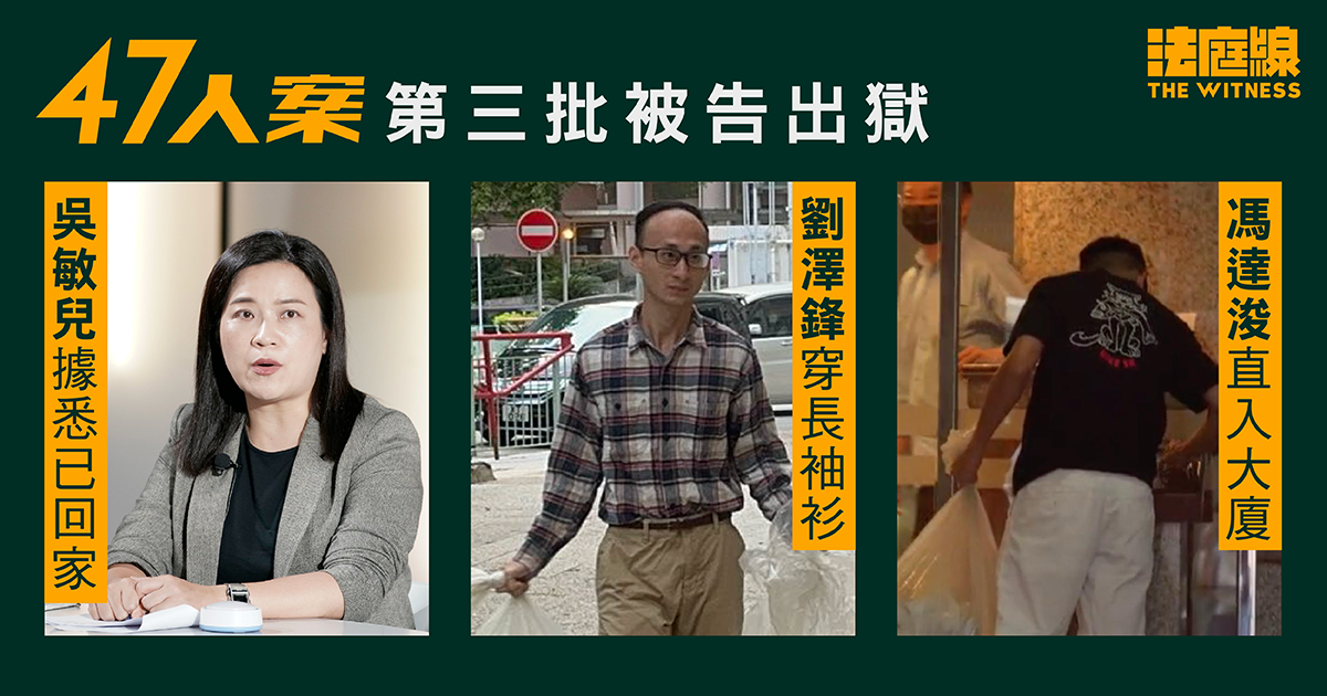 47 人案第三批 3 名被告吳敏兒、馮達浚、劉澤鋒周一(28 日)出獄。他們清晨由車接載離開,6 輛車全部拉上窗簾,監獄外的警力與之前相若,而被告住所附近同樣有警員戒備。
