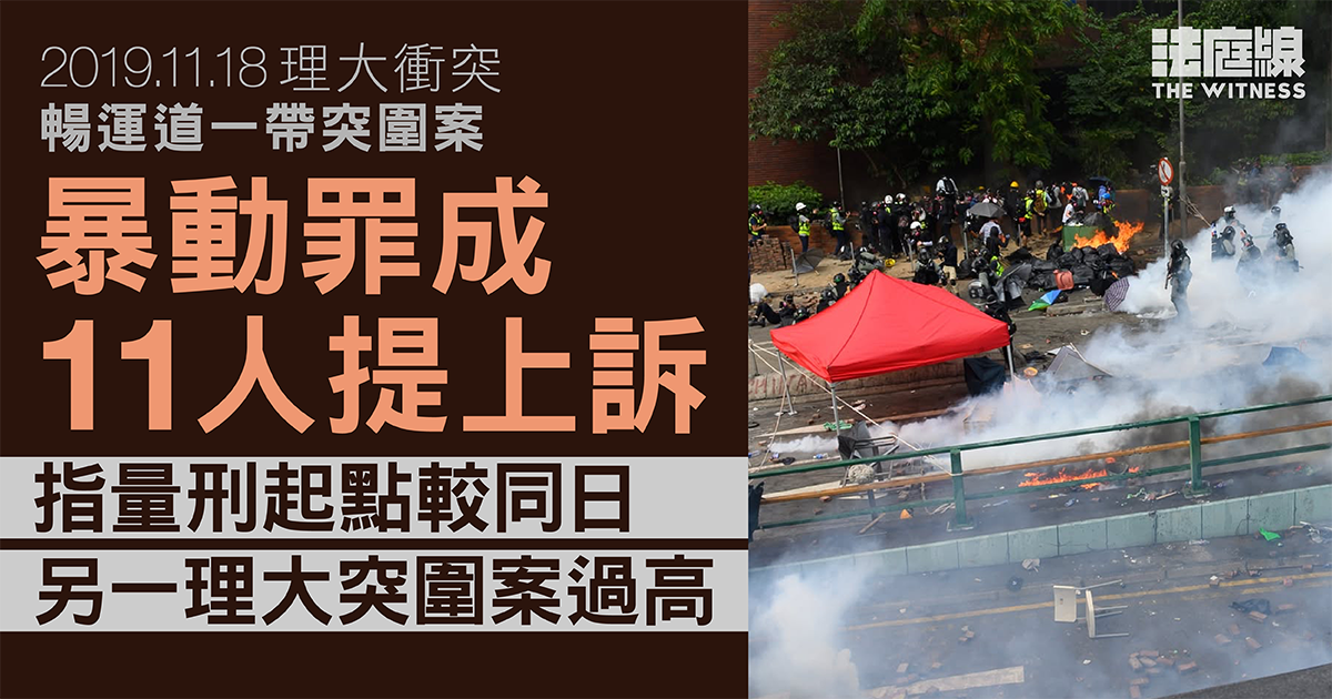 2019 年 11 月 18 日,警方圍堵理工大學,被指在暢運道一帶「突圍而出」被捕的 11 人,包括開審前改認罪、判囚 46 至 61 個月的 9 人,以及經審訊後定罪被判囚 6 年的另外 2 人,提出刑罰及定罪上訴。上訴庭周二(19 日)開庭處理,將於 6 個月內頒布判決。