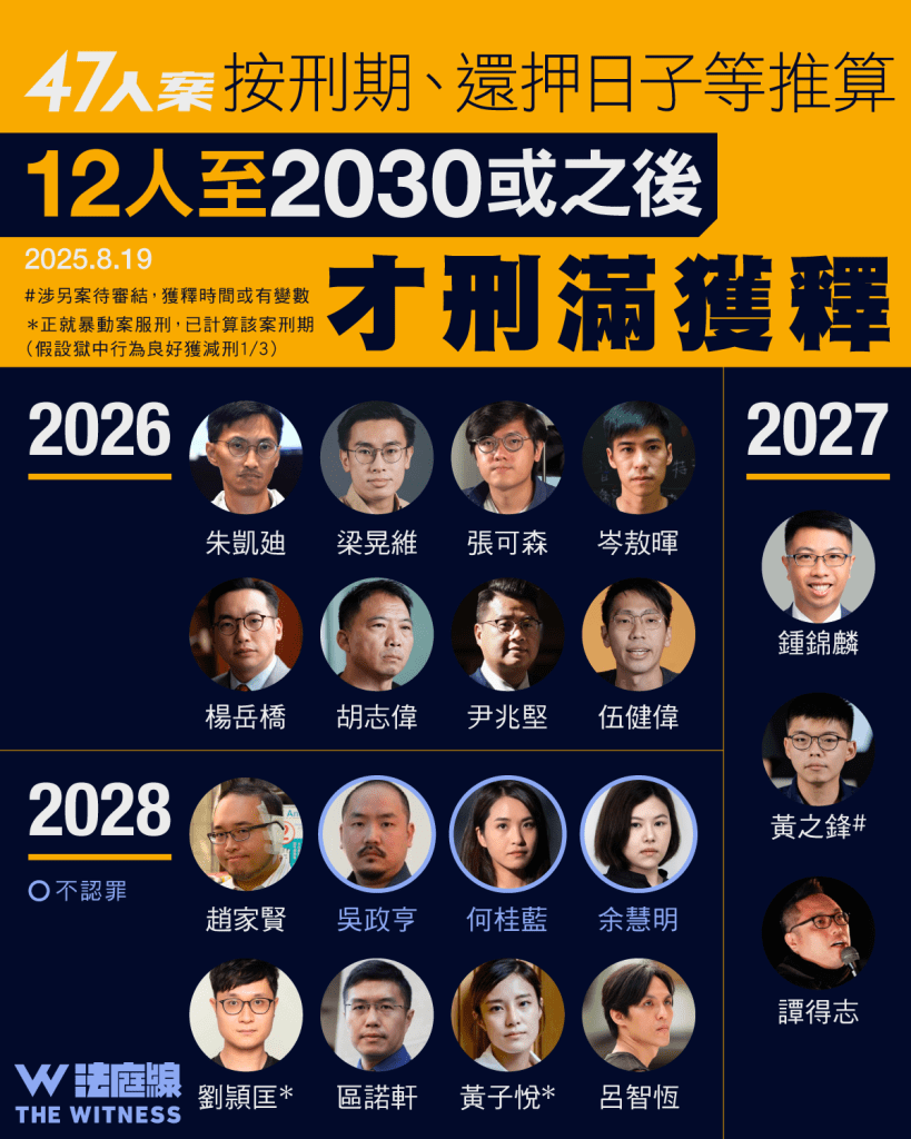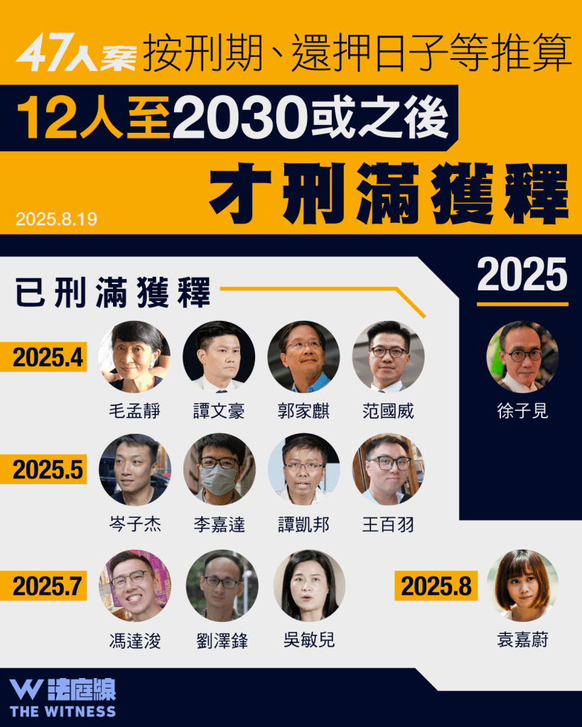 本案 45 人罪成,連同袁嘉蔚至今共 12 人出獄。《法庭線》整理餘下在囚被告預計刑滿獲釋時間,料 2025 年內仍有徐子見將出獄。尚在服刑的被告中,有 12 人預計將於 2030 年或之後才出獄。而黃之鋒、林卓廷涉另案原審或上訴未審結,出獄日子或有變數。