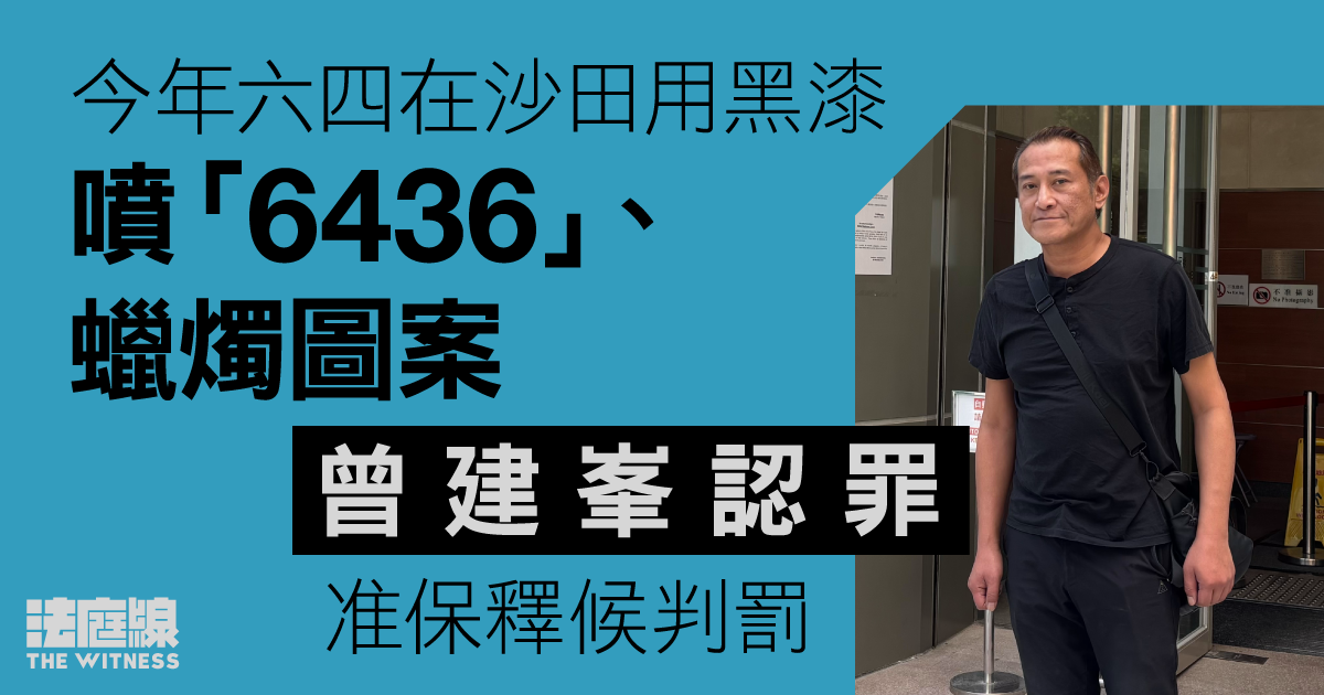 前公民黨成員、人稱「霸氣哥」的曾建峯,被指於今年六四在火炭馬路及告示欄,以黑色噴漆噴上「6436」、蠟燭圖案,被控刑事損壞。案件原定周四(4 日)在沙田裁判法院開審,被告開審前改為認罪。