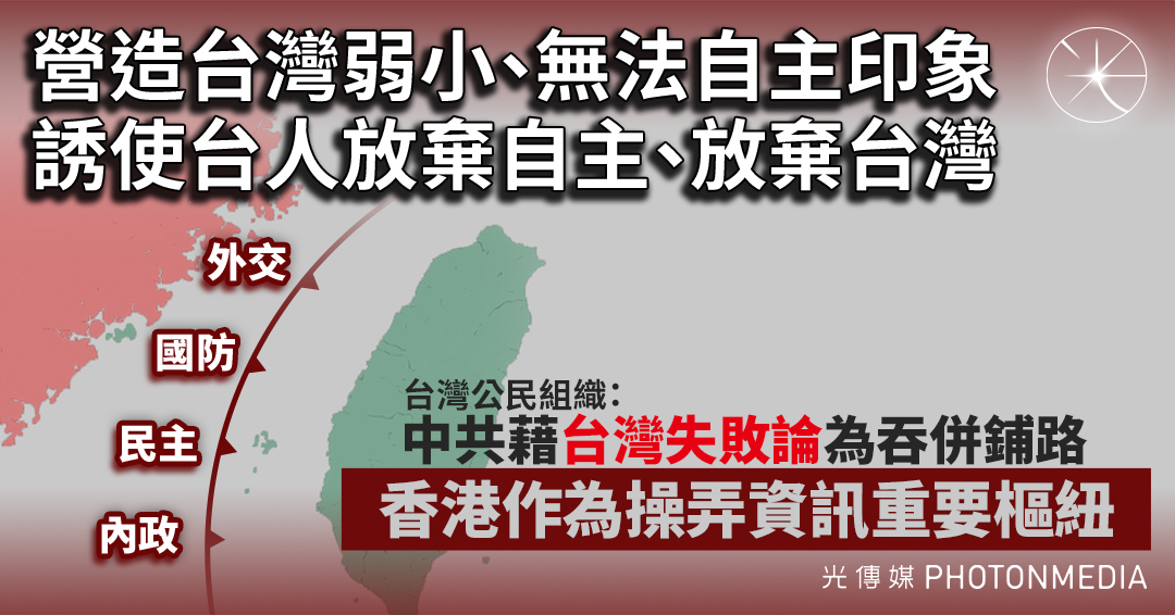 台灣公民組織「台灣資訊環境研究中心」(IORG)昨(23日)發表報告,揭示過去近六年來,中共利用台灣主流媒體、政治人物、政論名嘴與網紅,從外交、國防、民主及內政四大領域,有系統地宣揚「台灣失敗論」。報告指,這類論述旨在動搖台灣人民的自信,營造「台灣弱小、無法自主」的印象,為中共併吞台灣的終極目標創造有利條件。值得注意的是,報告點名香港也是操弄資訊的重要傳播樞紐,反映這場認知戰已跨越地域界限,對所有華語民主社群構成嚴重威脅。