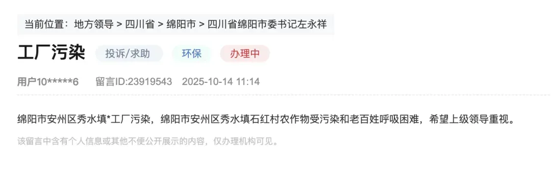 10月14日,一位用户向绵阳市委书记留言,言辞恳切而急迫:“绵阳市安州区秀水镇*工厂污染,绵阳市安州区秀水镇石红村农作物受污染和老百姓呼吸困难,希望上级领导重视”。