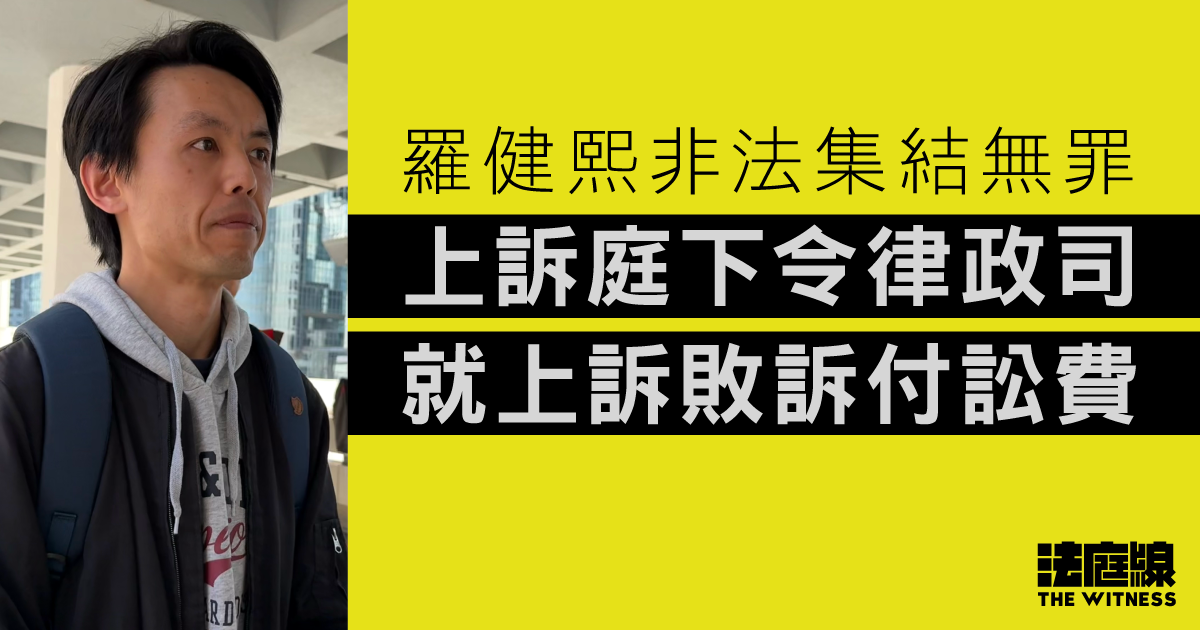判詞提到,律政司一方接受羅健熙聘用大狀沈士文和黃宛蓓為法律代表,但反對部分訟費申請,認為羅健熙應只取得一半訟費,因上訴庭「雖然認為無罪裁決並非有悖常理,但上訴並不是完全沒有道理」,而上訴庭亦認同原審法官誤讀案例,錯誤理解「非法集結」罪所須的「共同目的」。