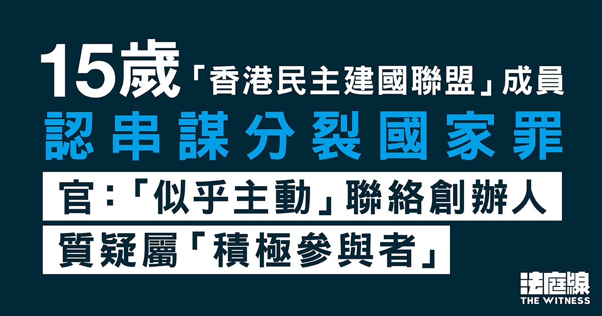 3 名男子被指是「香港民主建國聯盟」成員、推動「港獨」,被控《國安法》串謀分裂國家罪。其中案發時 15 歲男生被指在社交媒體宣傳「建國聯」、「香港議會選舉」,電話紀錄另顯示,他向「建國聯」創辦人稱,自己擅長分析和演講,同意為「建國聯」成立一個「情報部門」,以收集香港警察資料。