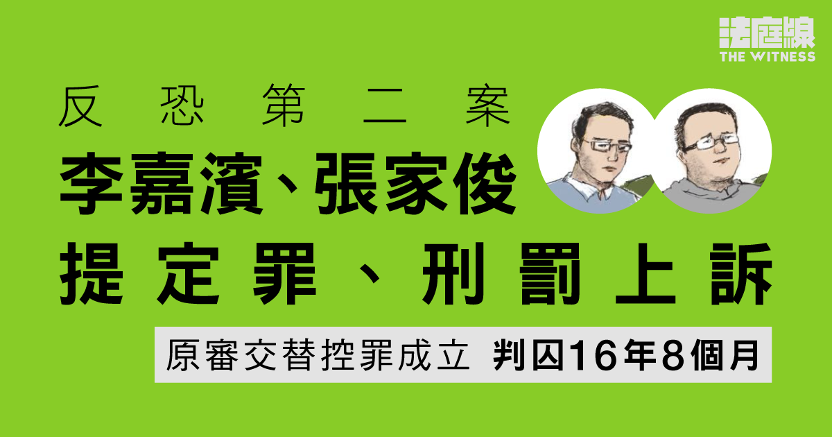 反恐條例第二案,陪審團裁定何卓為、張家俊及李嘉濱的「串謀導致相當可能危害生命的爆炸罪」交替控罪成立。當中,被判囚 16 年 8 個月的張家俊及李嘉濱,周一(10 日)提出定罪及刑罰上訴,案件暫未排期聆訊。