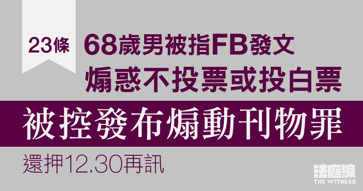 68 歲男子被指於去年 9 月至今年 11 月期間,於 Facebook 發布煽動帖文,內容包括煽惑他人在選舉中不投票或投白票等,被控《維護國安條例》下的「明知而發布具煽動意圖的刊物」罪,案件周四(20 日)於西九龍裁判法院首次提堂。
