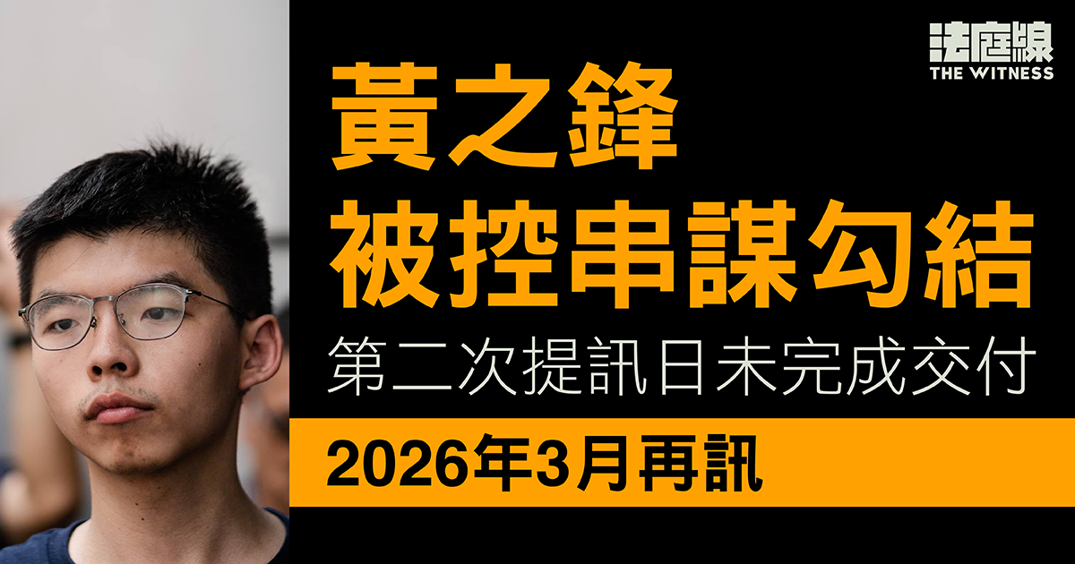 控方由高級助理刑事檢控專員劉德偉代表,辯方由大律師姚穎彤代表,案件由《國安法》指定法官、總裁判官蘇惠德處理。周五聆訊歷時不足 5 分鐘,蘇惠德決定押後至 2026 年 3 月 6 日再訊。