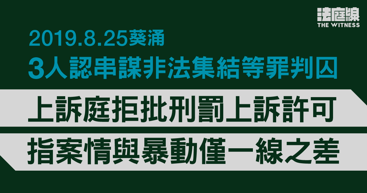 2019 年 8 月 25 日的「荃葵青遊行」原獲警方批准,及後有人堵路,遭警方驅散。3 人開審前承認串謀非法集結等罪,分別判監 30 個月、28 個月及 25 個月,他們提出刑罰上訴但被駁回,上訴庭周二(18 日)頒下判詞。