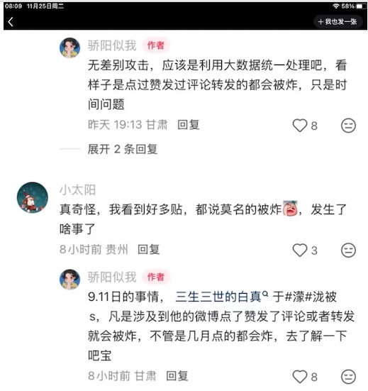 “好像不能随便点赞”“无差别攻击,应该是利用大数据处理吧,看样子是点过赞发过评论转发的都会被炸,只是时间问题”“9.11的事情,凡是涉及到他的微博点了赞发了评论或者转发都会被炸,不管几个月的都会被炸”“极度恶心,还极度莫名,根本不知道原因”。