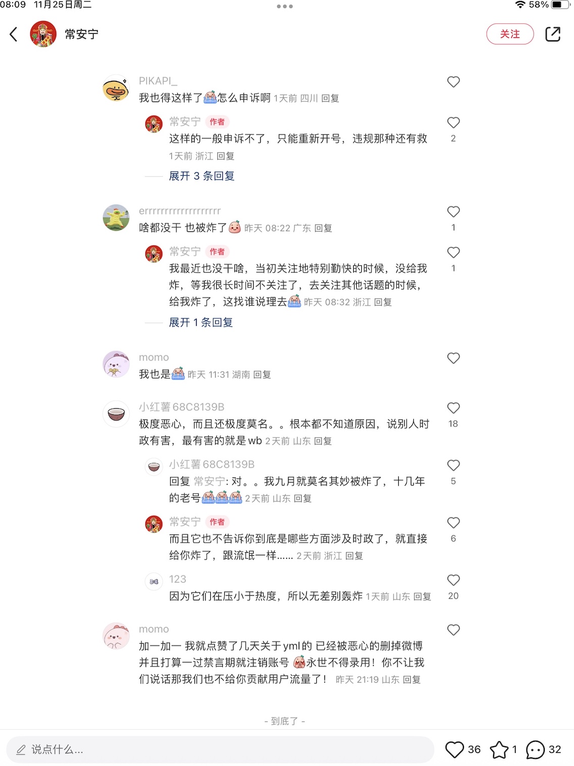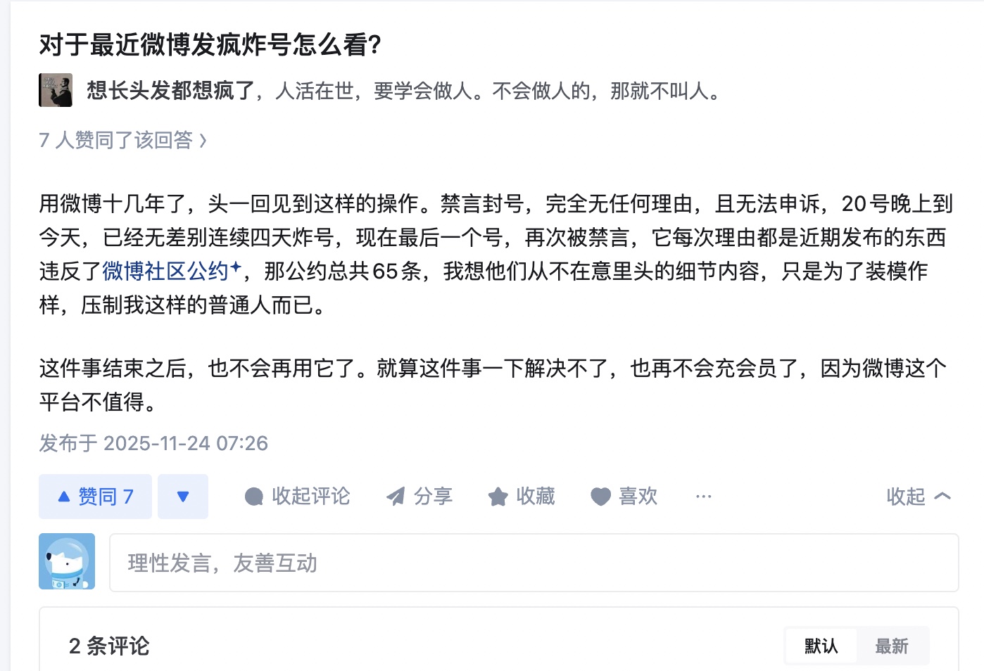 同日,在大陆知乎平台,一个题为“对于最近微博发疯炸号怎么看?”的贴文下,也有很多网友抱怨自己的微博账号被封,“用微博十几年了,头一回见到这样的操作。禁言封号,完全无任何理由,且无法申诉,20号晚上到今天,已经无差别连续四天炸号,现在最后一个号,再次被禁言,它每次理由都是近期发布的东西违反了微博社区公约,那公约总共65条,我想他们从不在意里头的细节内容,只是为了装模作样,压制我这样的普通人而已”。