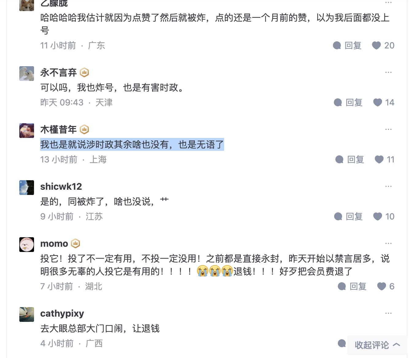 “我估计就因为点赞了然后就被炸,点的还是一个月前的赞,以为我后面都没上号”“我也炸号,也是有害时政”“有一波炸的就是在鲁迅超话的号”“一般都是说摄政所以给你封掉”。