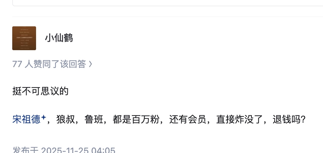 还有网友透露,一些拥有百万粉丝的微博大V也因为于朦胧事件发声,被封号,“宋祖德,狼叔,鲁班,都是百万粉,还有会员,直接炸没了,退钱吗?”
