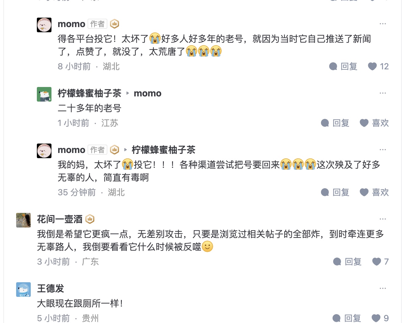 很多网友表示,当局越是压制,就越要抗争到底,“有写信的内容吗,有的话,发我下,鱼(于朦胧)和小孩(云南“野孩子”)管定了”“黑云的那个孩子,一定跟它们干到底”“陪他们慢慢玩,来日方长,这笔账要算回来的,大家去干它股票”“大家记得去应用商店送它一颗星星来感谢它帮我们变相破圈”“得各平台投它!太坏了,好多人好多年的老号,就因为当时它自己推送了新闻了,点赞了,就没了,太荒唐”“我倒是希望它更疯一点,无差别攻击,只要是浏览过相关帖子的全部炸,到时牵连更多无辜路人,我倒要看看它什么时候被反噬”。
