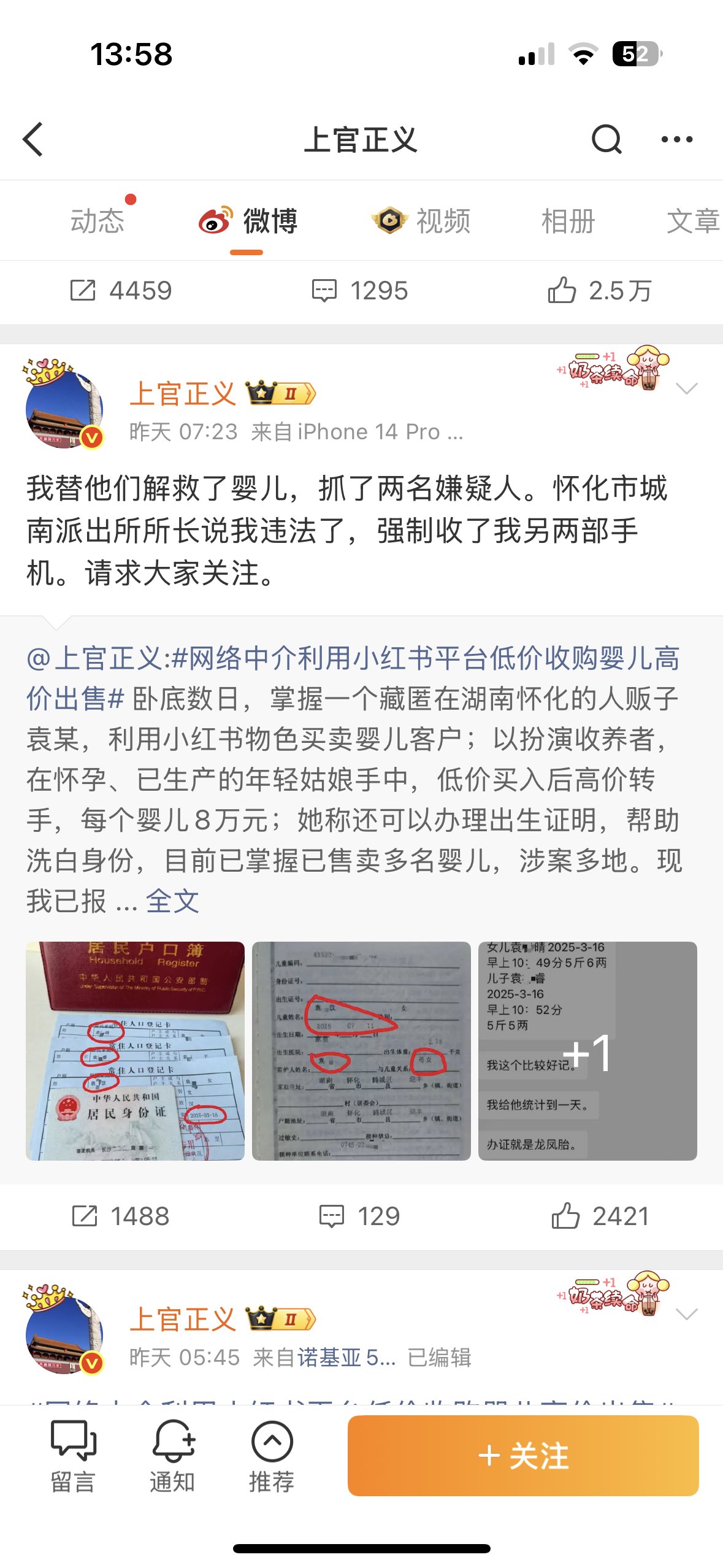 当天稍后,上官正义发帖称,“我中午替他们解救了婴儿,抓了两名嫌疑人。怀化市城南派出所所长说我违法了,强制收了我两部手机,(派)专人看管我。请求大家关注。”