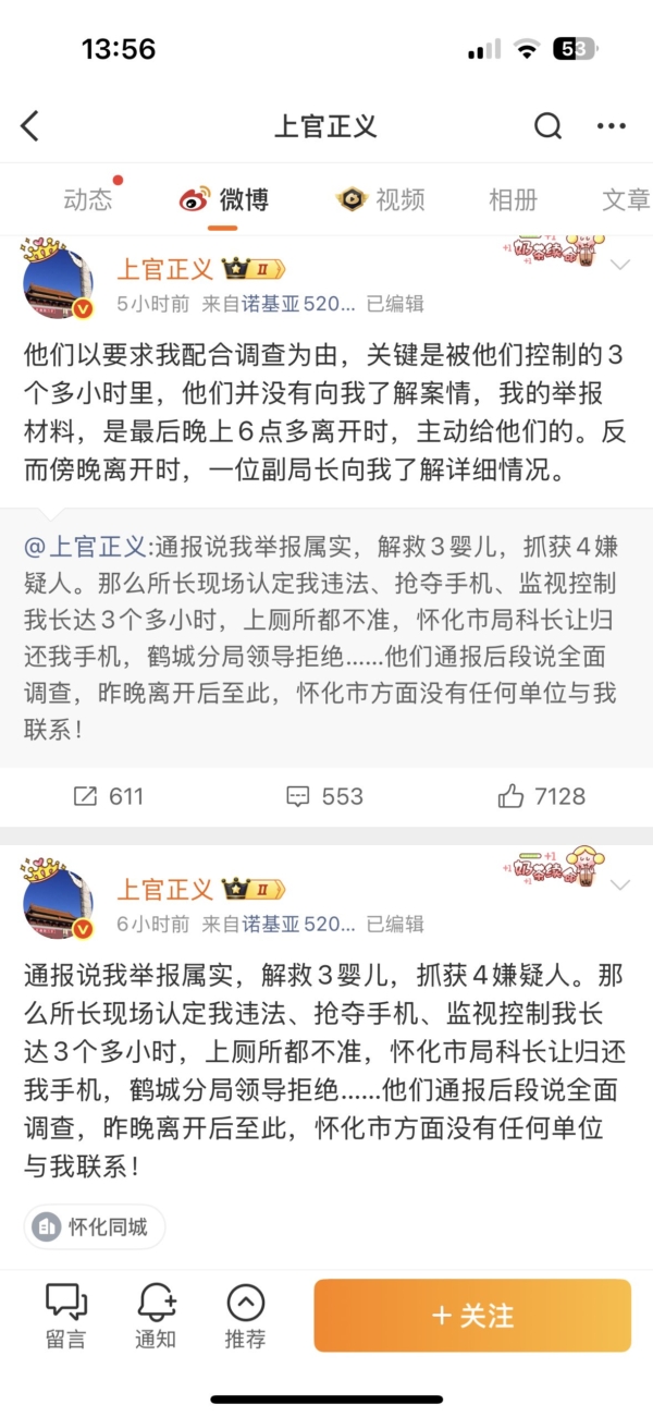 在2日警方通报发布后,上官正义再次发文表示:“通报说我举报属实,解救3婴儿,抓获4嫌疑人。那么所长现场认定我违法、抢夺手机、监视控制我长达3个多小时,上厕所都不准,怀化市局科长让归还我手机,鹤城分局领导拒绝……他们说全面调查,昨晚离开后至此,怀化市方面没有任何单位与我联系! ”