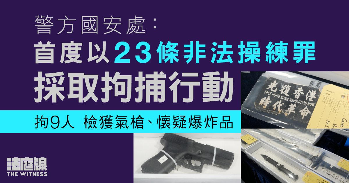 警方國安處周五(12 日)舉行記者會,指周四晚上突擊搜查新蒲崗一個工廈單位,首度以 23 條「非法操練」罪拘捕 9 名男子,指他們涉嫌進行類似軍事形式的訓練。警方在單位檢取氣槍、懷疑爆炸品,以及印有「黑暴份子」常用口號的繡章。