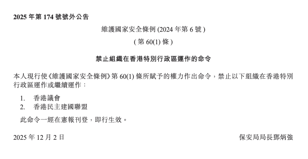 事隔 8 日,政府憲報周二刊登由保安局長鄧炳強署名的公告,指他現行使《維護國家安全條例》第 60(1) 條所賦予的權力作出命令,禁止「香港議會」、「香港民主建國聯盟」在特區運作或繼續運作,並指命令一經刊憲,即行生效。