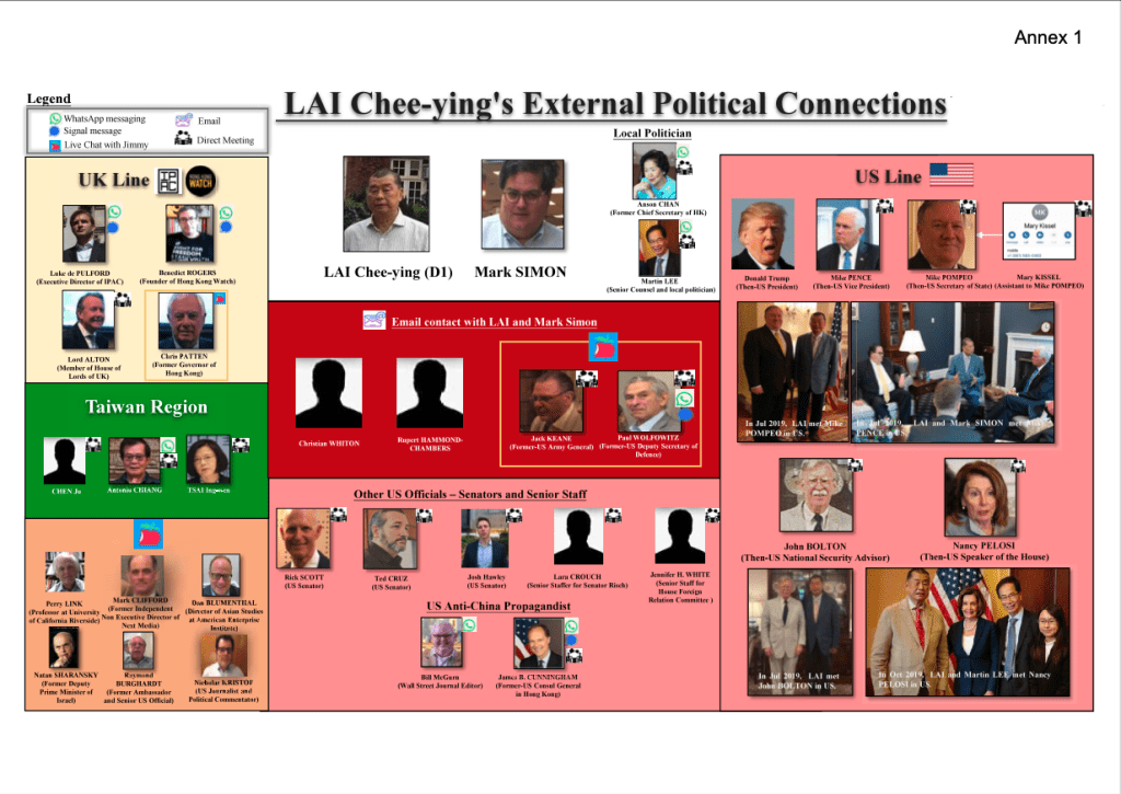 判詞最後附上,控方早前於審訊時所展示,黎與各國政治人物的聯繫圖,當中包括本地、台灣、美國、英國聯繫。