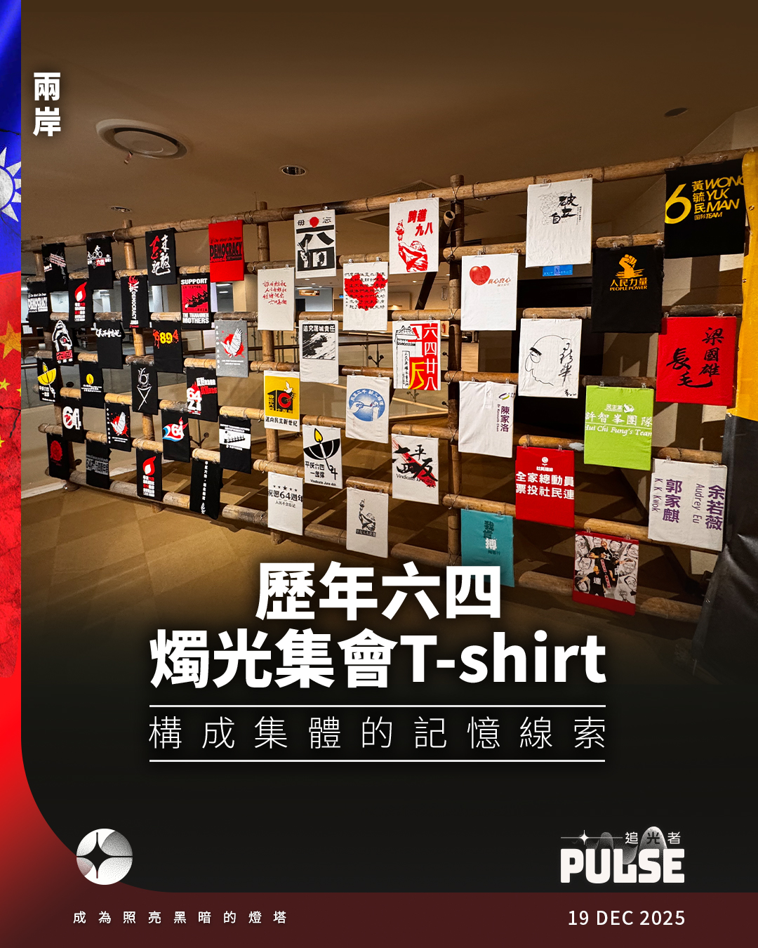 若說「小平你好」是一個起點,展廳另一端的牆上,大量六四維園燭光集會的T-shirt,則構成了另一條更長、更集體的記憶線索。陳健民提到,收到不少六四集會衣服的捐贈,反映大量香港市民曾長年參與悼念活動;這些衣服之所以重要,不只是「曾經有人去過」,而是它們記載着一種公共儀式、公共情感與公共記憶,以及世代之爭。