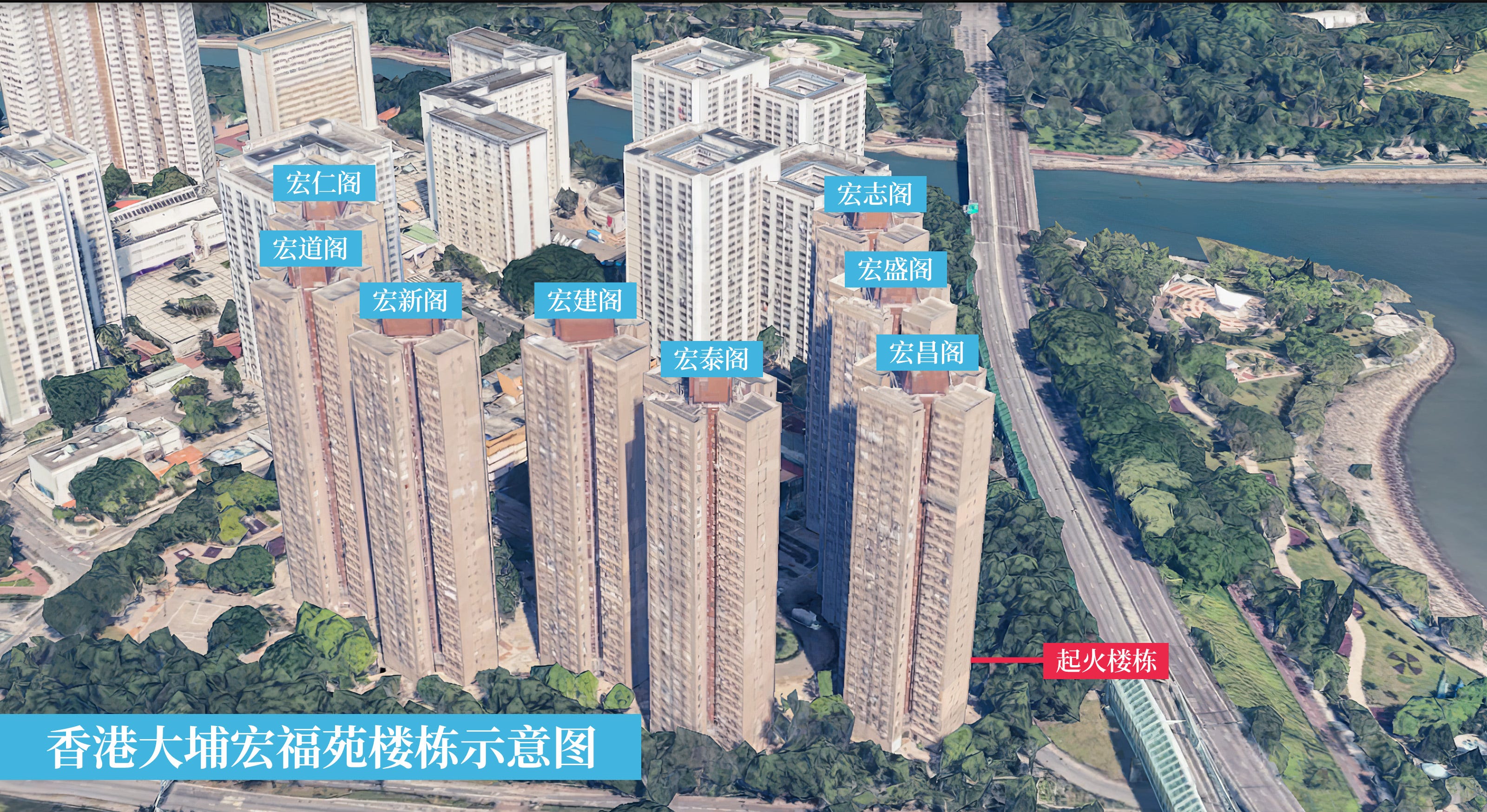 火警发生于11月26日下午14点51分。宏福苑共有8栋31层高楼,当时正在进行维修工程,外墙覆盖着绿色棚网与竹制棚架。火源最初出现在F座宏昌阁底层外墙,仅六分钟便延烧至四楼,随后一路窜升至高层,并蔓延至其余7栋高楼——这是香港过去70余年来最惨重的一次火灾,燃烧了至少43小时才得以扑灭。