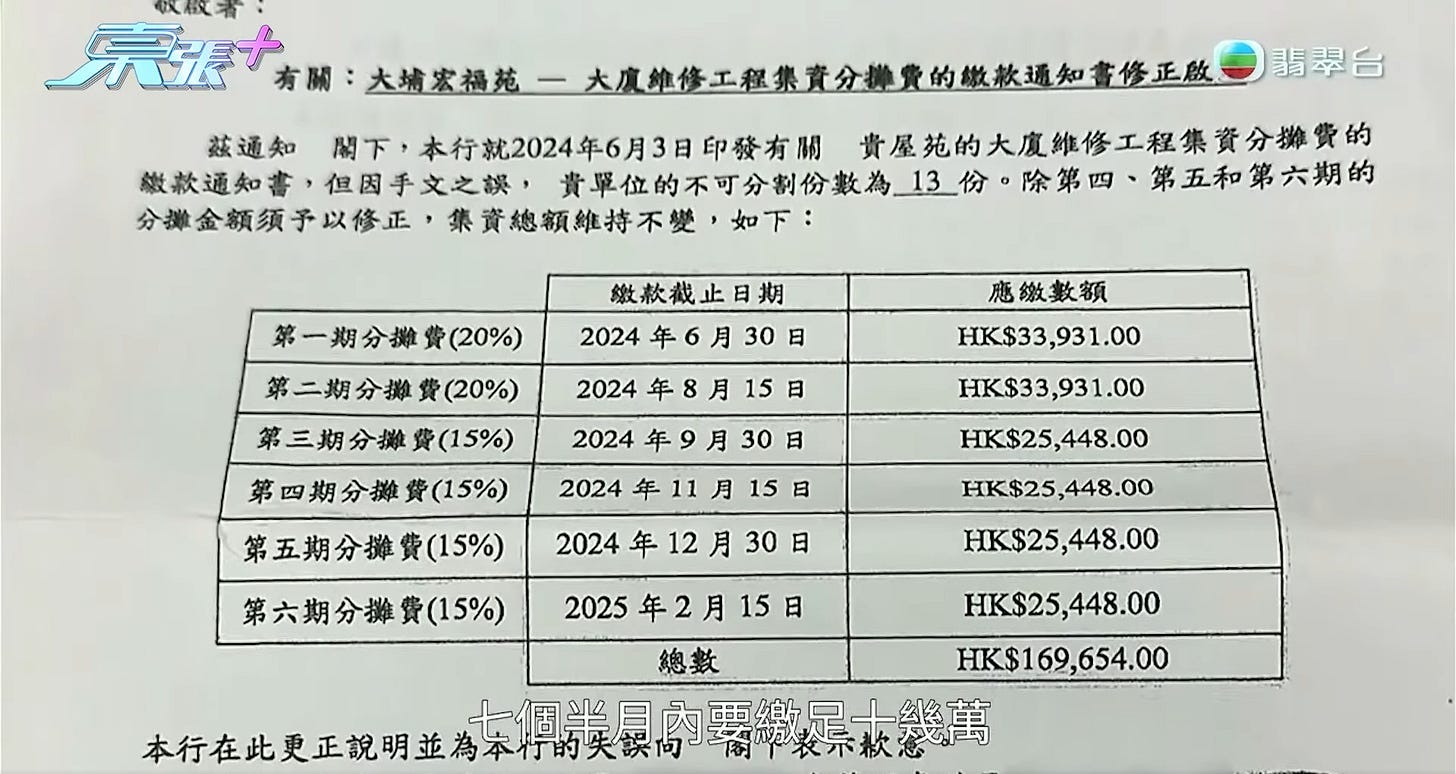 宏福苑在2016年接到强制验楼通知。2024年,业主法团通过一项总额3.3亿港元的维修方案,摊到1984户住户头上,平均每户需承担16万至18万港元,且要在半年内缴清,否则可能被追讨甚至诉诸法律。许多居民对此心存疑虑,怀疑承建商与宏福苑业主立案法团之间存在利益输送,导致工程报价虚高。