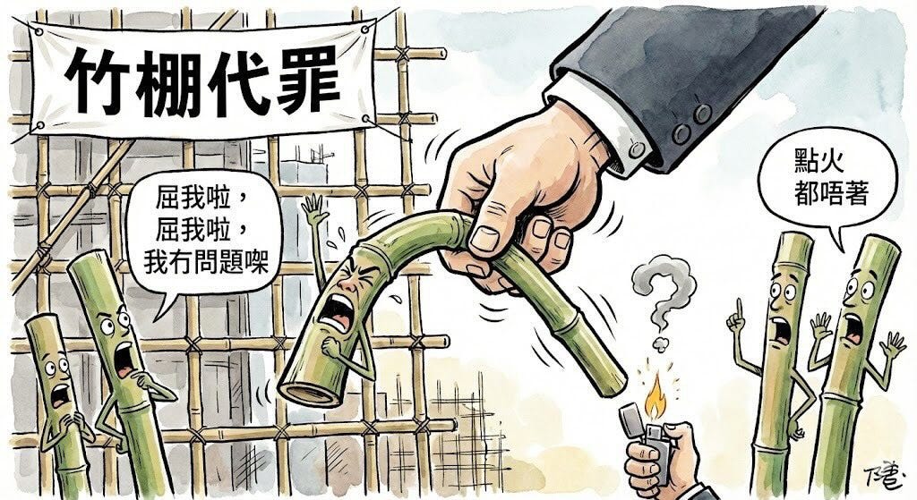 火灾发生后不久,在中国内地舆论场,竹棚架一度成为众矢之的,并成为某种香港“生产力落后”的象征。然而,港人社交媒体很快出现各种以“竹子受委屈”为主题的梗图,还有人在悼词中直言,“应该被取代的,从来不是竹子”。