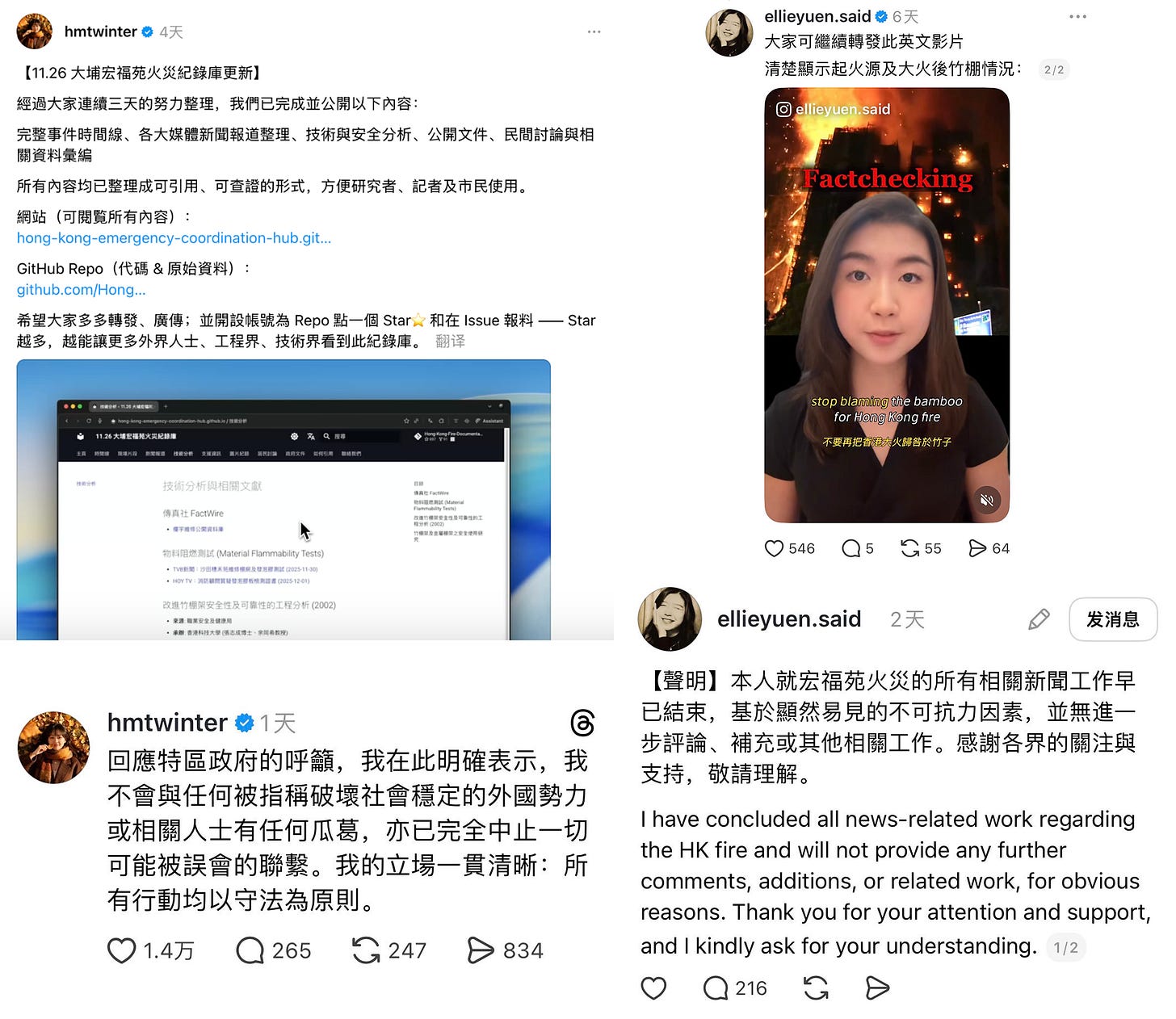 香港大学主修新闻及国际政治的学生Ellie Yuen,曾在灾后录制中英文视频,讲解火灾原因和大维修工程,反驳将事故原因归咎于竹棚,获得超过500万次浏览量。4日凌晨,她也发帖表示,基于显然易见的不可抗力因素,不再对宏福苑火灾作进一步评论、补充或其他相关工作。