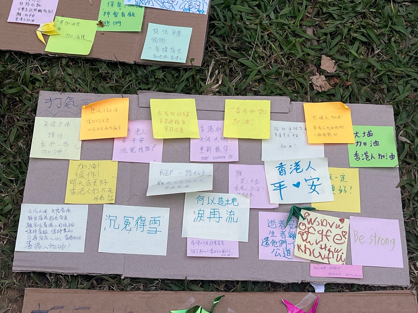 在义工的维护下,围绕着广福公园休息亭的留言墙,成为难得的公众情绪出口,持续展示在世人面前。在告别逝者、宽慰生者、铭谢消防员的温情之外,追问事故真相、要求问责政府的只言片语也不绝如缕:“棚架无错,错在制度,还我真相”“丐帮有几多人,唔系由我哋决定,系由皇帝决定。(丐帮有多少人,不是由我们决定,是由皇帝决定。)不要麻木,保持愤怒”“沉冤得雪”……12月2日“头七”当晚,一则拍摄部分现场留言的帖子,配文“请看看香港人的愤怒”,获得大量转发。