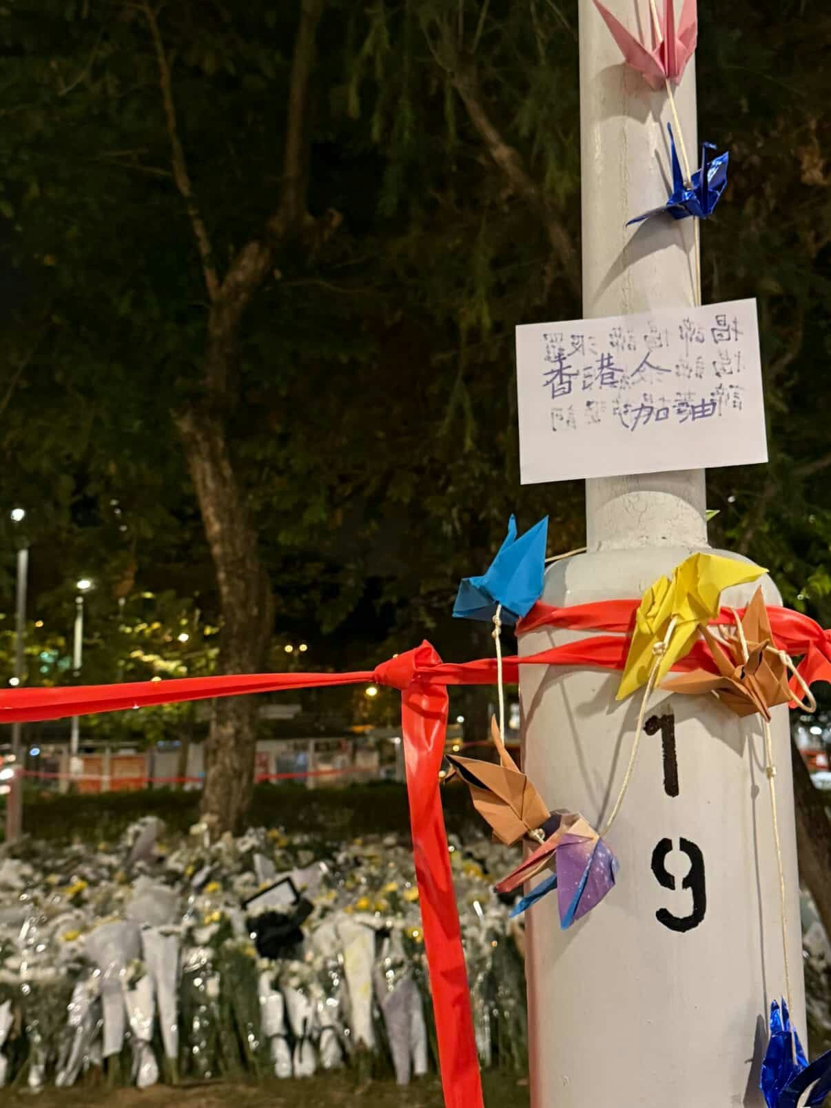 广福邨平台被征用后,广福公园休息处成了更多人汇集的悼念之地。11月29日清晨,“WOMEN我们”记者看到,这里已摆满了白菊与纸鹤,而警察与国安人员加强巡逻,检查证件,工作人员提醒居民“不要逗留太久”。一名义工说:“你站在那里,不知道自己能帮到什么,但只要参与,就算是一种帮助。”
