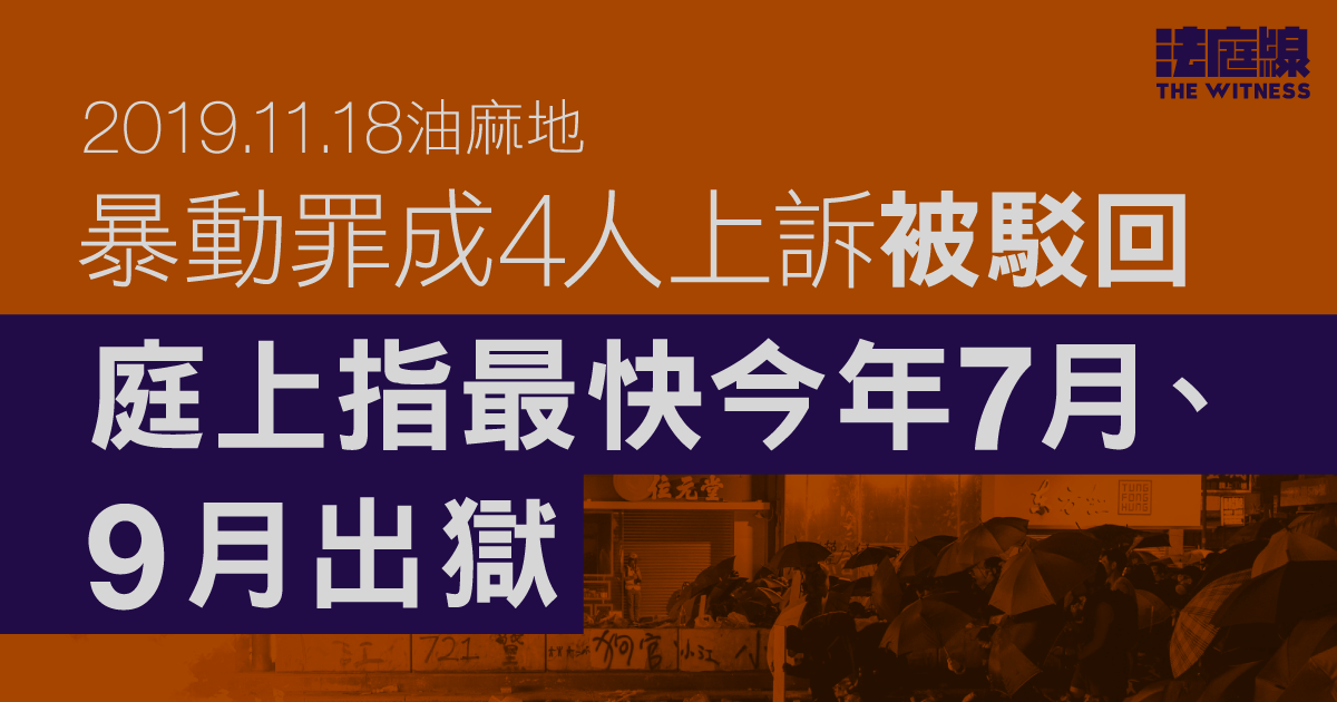 法官關注案中刑罰沒明顯過重,上訴庭不宜介入,而定罪上訴理據已於同類案件駁回,另指律政司一方遺漏近期判例。庭上披露,4 名上訴人最快將在今年 7 月及 9 月相繼出獄。