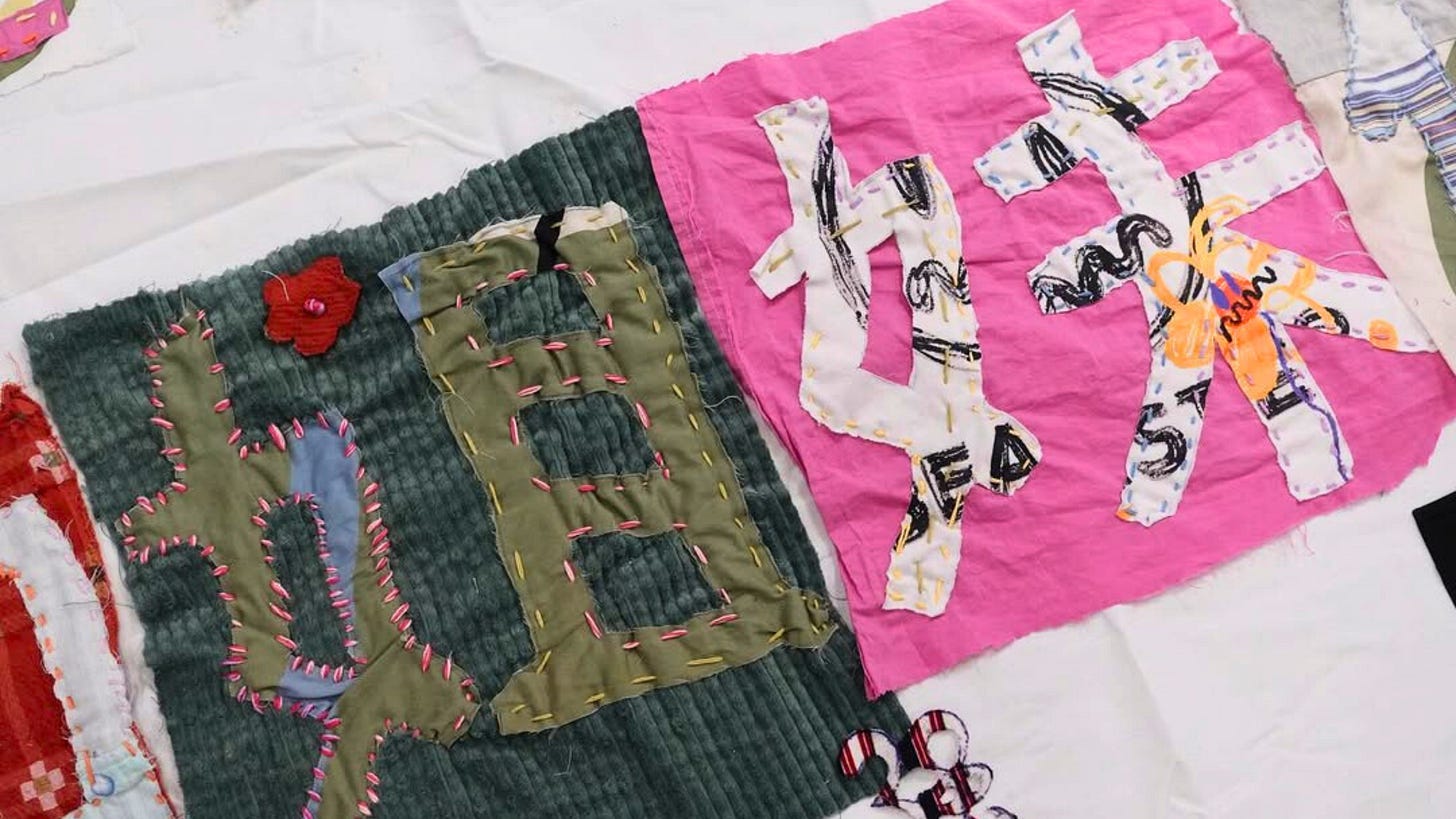 2025年3月,英国伦敦中国女权主义者缝制的妇女节游行标语 来源:@weareallchainedwomen