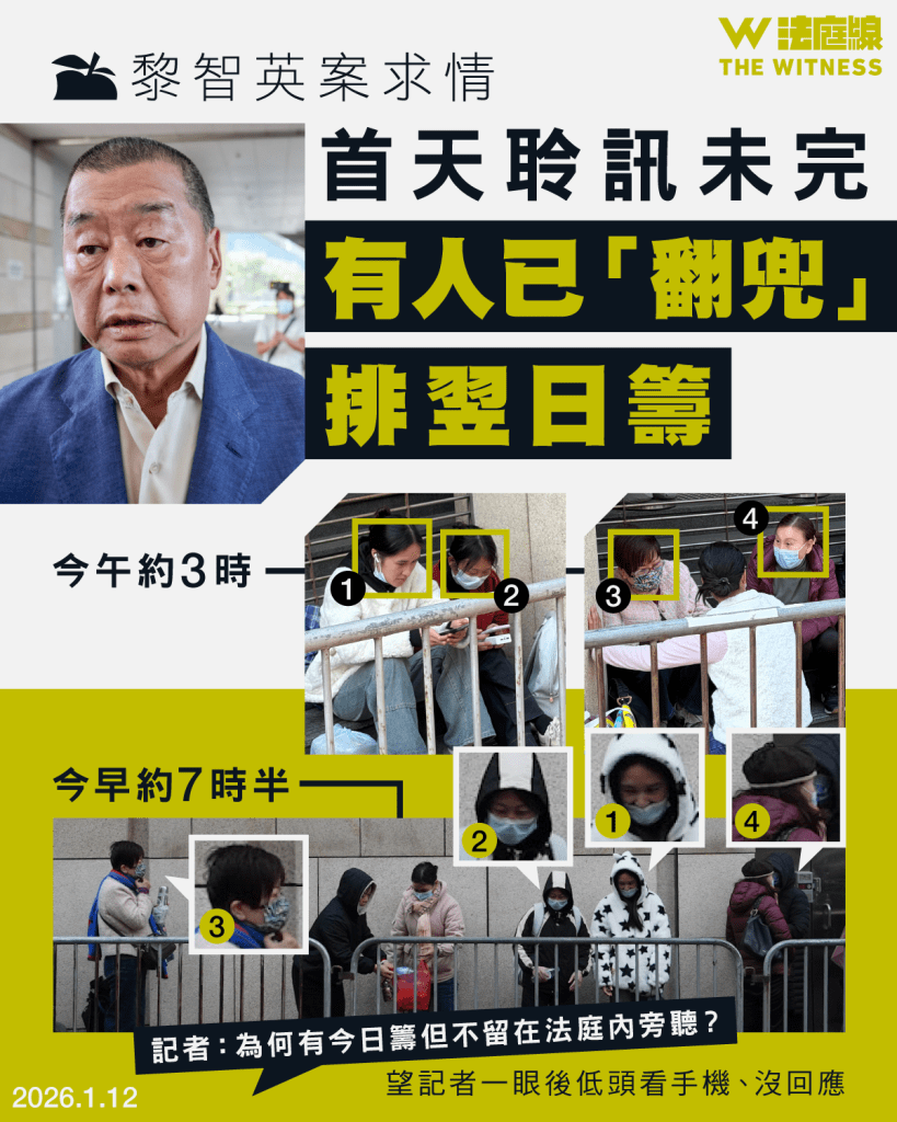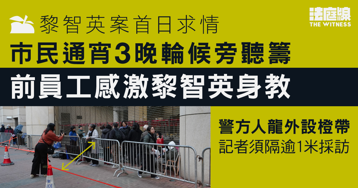 同樣周五已來排隊的黃小姐指,上月裁決日只有一位非「排隊黨」的市民入到正庭,「如果我哋唔早幾日嚟,我諗我哋入唔到(正庭)」,又指過去幾日天氣寒冷,在法院外難以入睡,「但點樣辛苦排幾日都要嚟,如果講辛苦,我哋梗係唔及黎生辛苦,佢喺入面幾年⋯⋯我哋排幾日,我覺得係一粒微塵。」