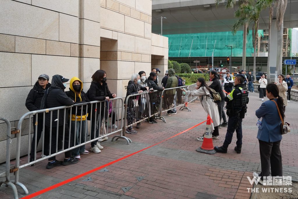 警方在人龍外設置橙帶,及後收窄以鐵馬圍起的排隊範圍,記者於橙帶外須隔逾 1 米採訪。另外,中午 12 時許,首日聆訊仍未結束,已有逾 50 人在庭外排隊輪候翌日旁聽籌。