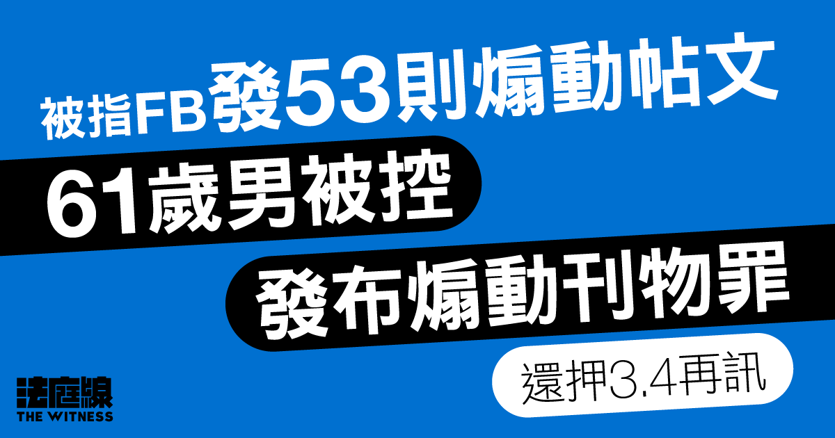 61 歲退休漢被指 2024 年至 2025 年間,在 Facebook 發布 53 則帖文,內容涉及提倡港獨及非法行為,去年 11 月 29 日被捕。他被起訴一項「明知而發布具煽動意圖的刊物」罪,周四(8 日)於西九龍裁判法院首次提堂。