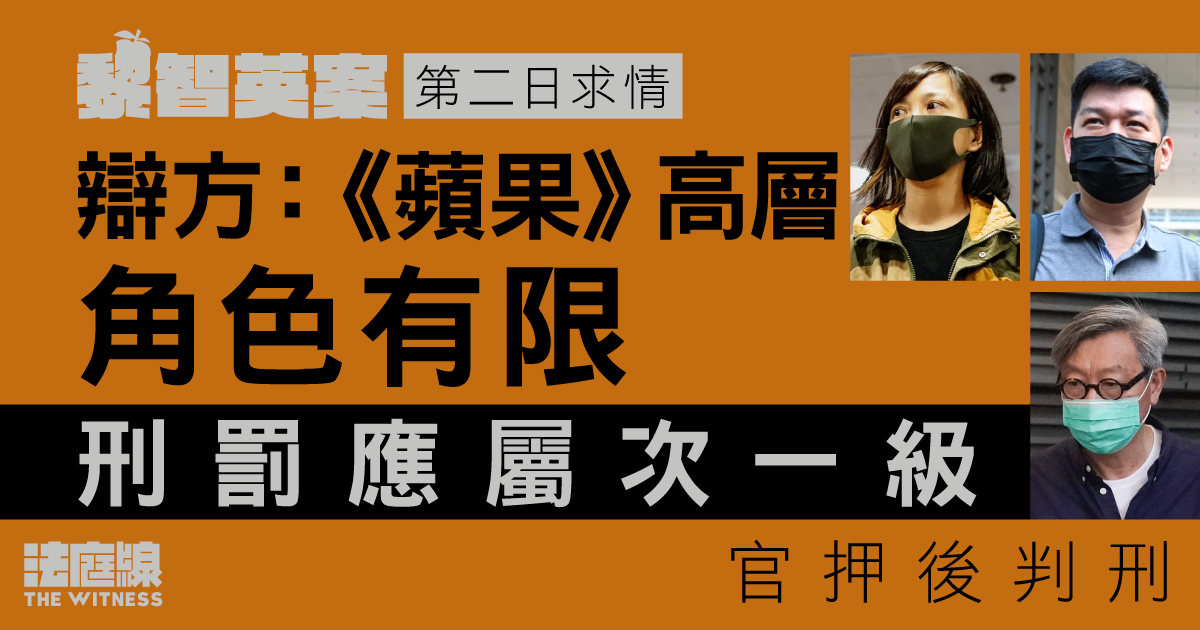 是日主要處理 5 名前《蘋果》高層的求情,辯方強調,各人角色有限,希望法庭量刑時可考慮個人行為,指陳沛敏、林文宗、馮偉光的刑罰,應定為較輕一級,即判囚 3 至 10 年以下;楊清奇、羅偉光一方則沒提及分級。